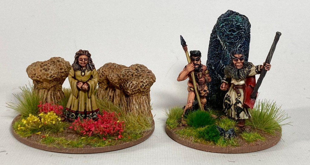 Tailtiu, Queen of the Fir Bolg and Cesar the Druid. Cesar has been based up with an old Fantasy Warlord standing stone.