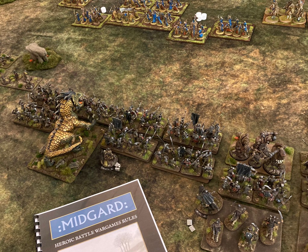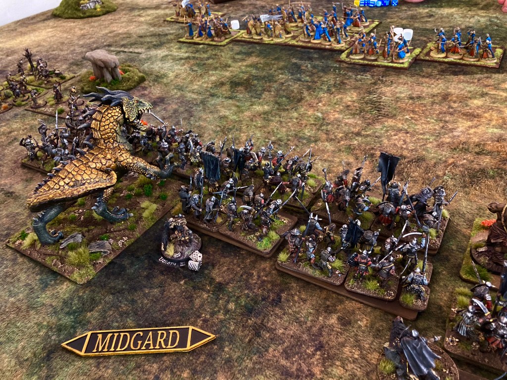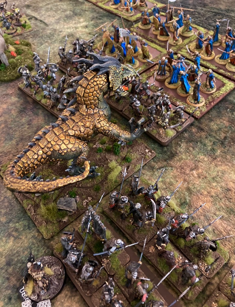 My Midgard rules are still in play testing prior to publication (at some point in the future but no date yet). After several weeks of Dark Ages battles, I wanted to return to a playing a fantasy scenario including a dragon – in this case, Glaurung, the wingless wyrm from Tolkien’s Silmarillion.  (The model is a Schleich toy that I converted and painted last year – see here).
