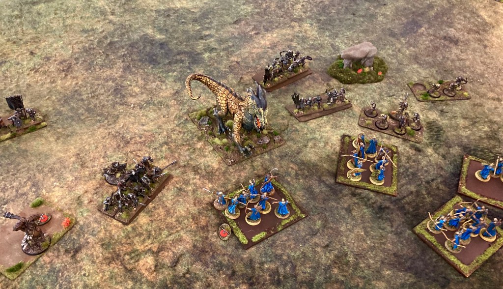 Wary of the hail of arrows that had greeted Glaurung in his first game (Paul had sportingly reduced his archery quota in the interests of play testing), I put a line of Orcs in front of the dragon in a effort to distract the pointy-eared bow fans. I eschewed my usual tactic of ‘charge them in the face’ (copyright @ Tom WD) and opted for a slower advance that wouldn’t burn up my Heroes’ limited Mighty Deeds (the key leadership mechanism in Midgard).  However, I went aggressive on the left flank, sending all five units of Orc scouts up to harass the two units of Elves in position there.