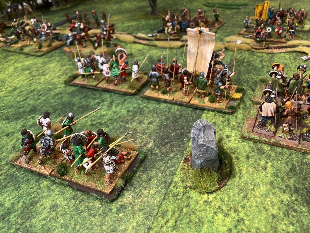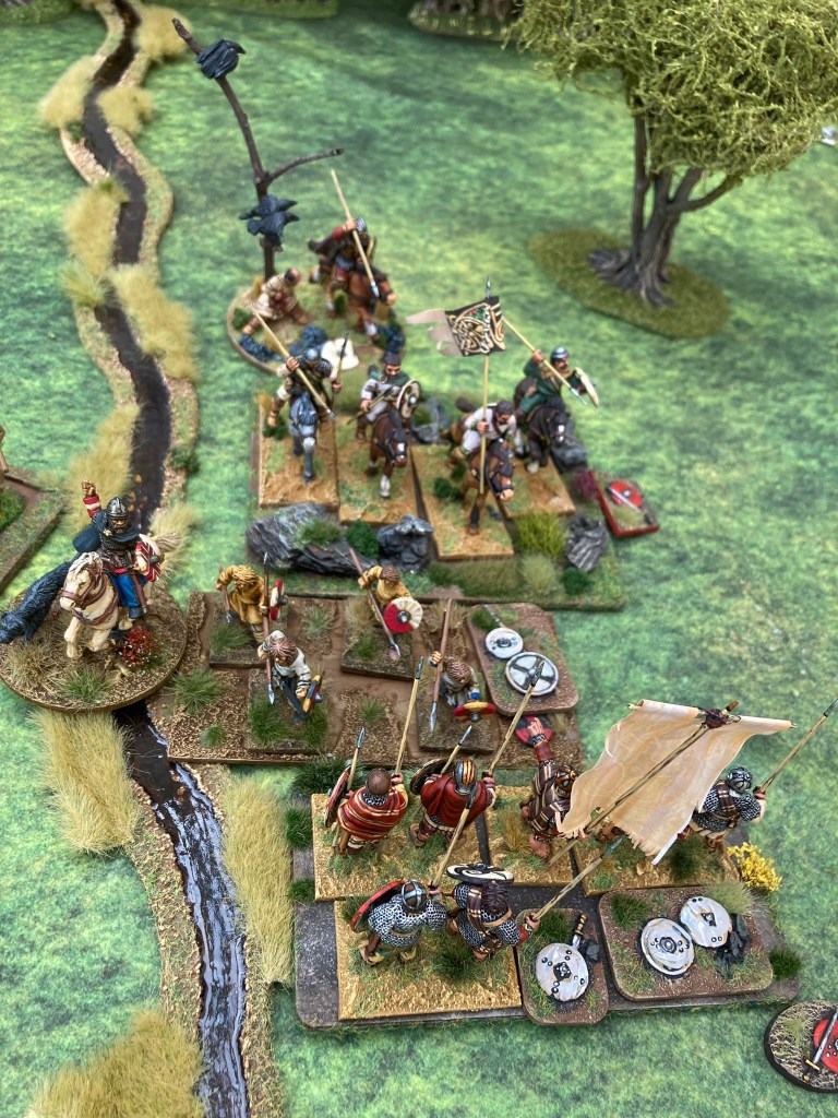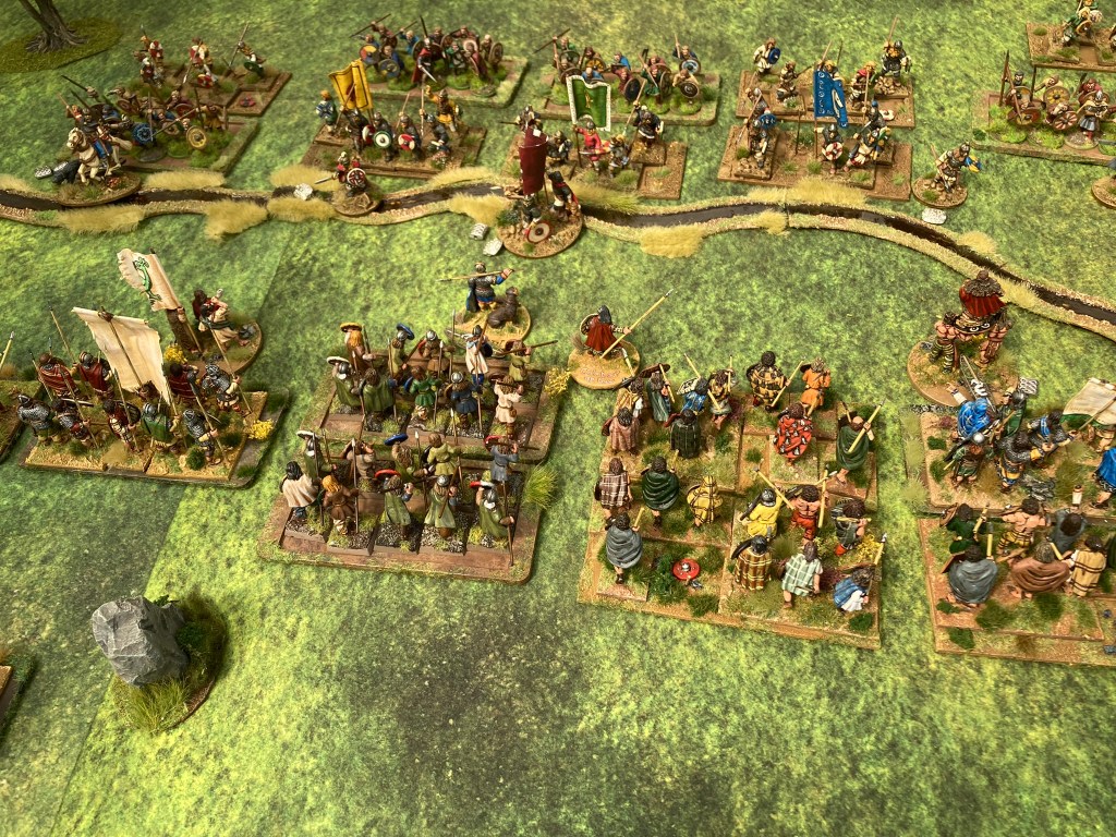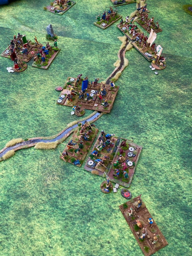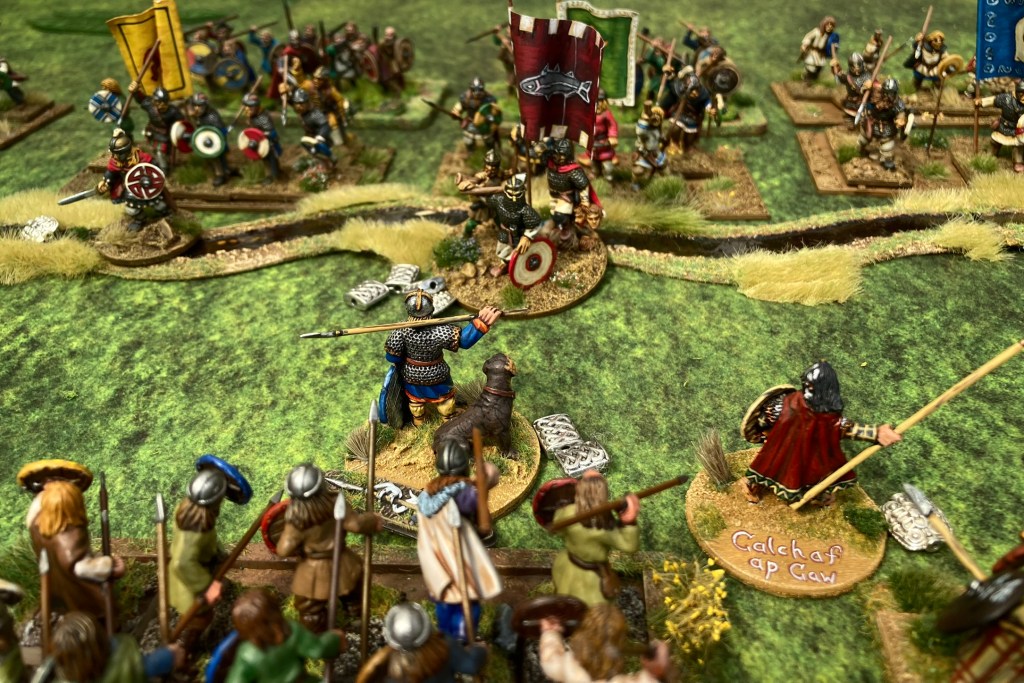 Scrivs and Chris (Winston ap Rees) took the role of Aethelfrith of Northumbria and his Saxons, trying to lay down the law with Aedan Mac Gabhran, King of Dal Riada (played by myself and Tom WD). The standard ‘charge them in the face’ tactic was slightly obstructed by having to cross the burn in the centre of the table, which resulted in some javelin-hurling across the water, causing some casualties amongst the Northumbrians. The Dal Riadans hurled themselves forwards with Saxon exile Hering, Son of Hussa* and his comitatus going straight for Aethelfrith himself.