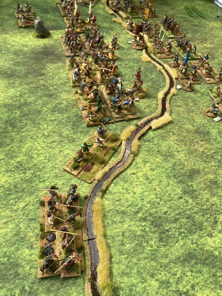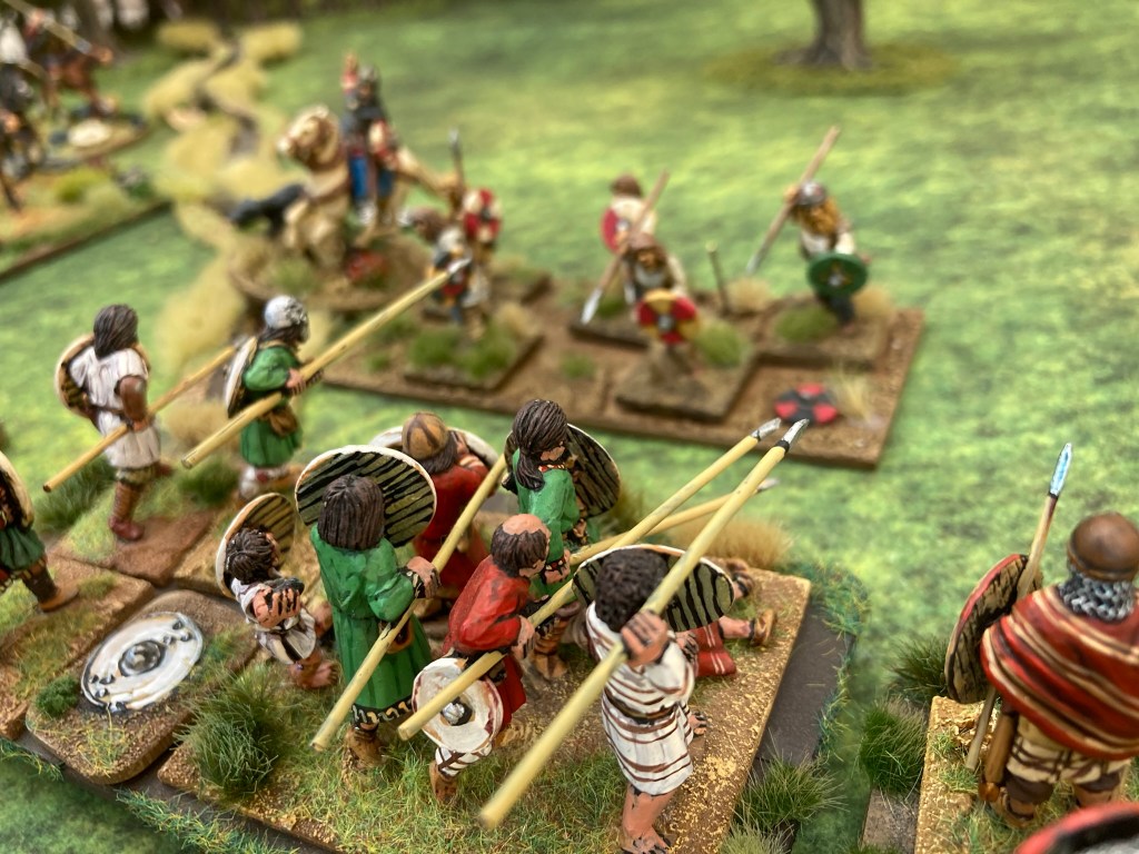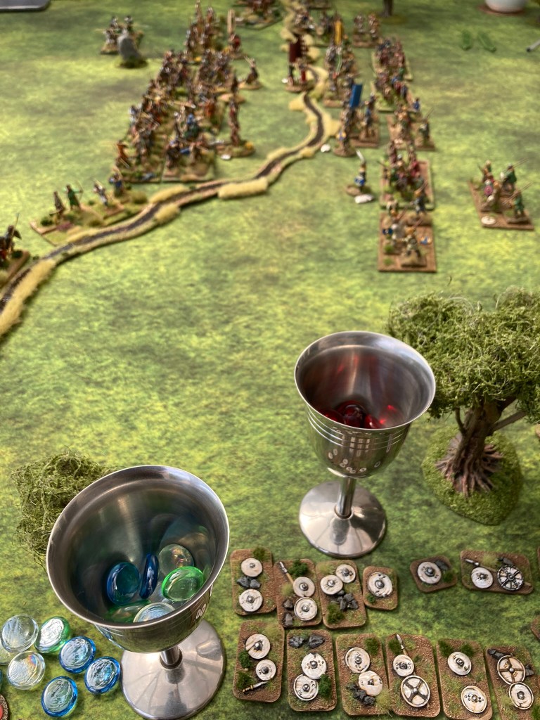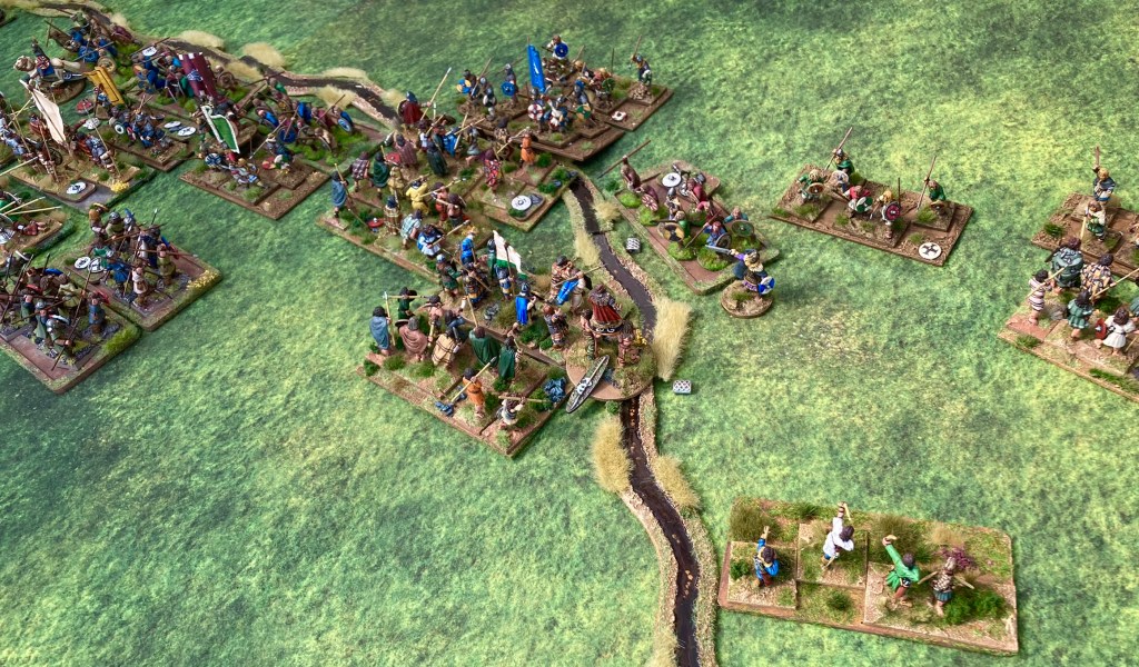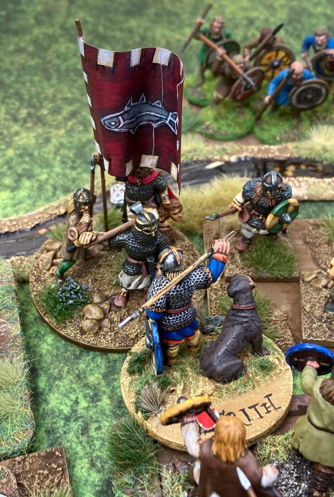 Scrivs and Chris (Winston ap Rees) took the role of Aethelfrith of Northumbria and his Saxons, trying to lay down the law with Aedan Mac Gabhran, King of Dal Riada (played by myself and Tom WD). The standard ‘charge them in the face’ tactic was slightly obstructed by having to cross the burn in the centre of the table, which resulted in some javelin-hurling across the water, causing some casualties amongst the Northumbrians. The Dal Riadans hurled themselves forwards with Saxon exile Hering, Son of Hussa* and his comitatus going straight for Aethelfrith himself.