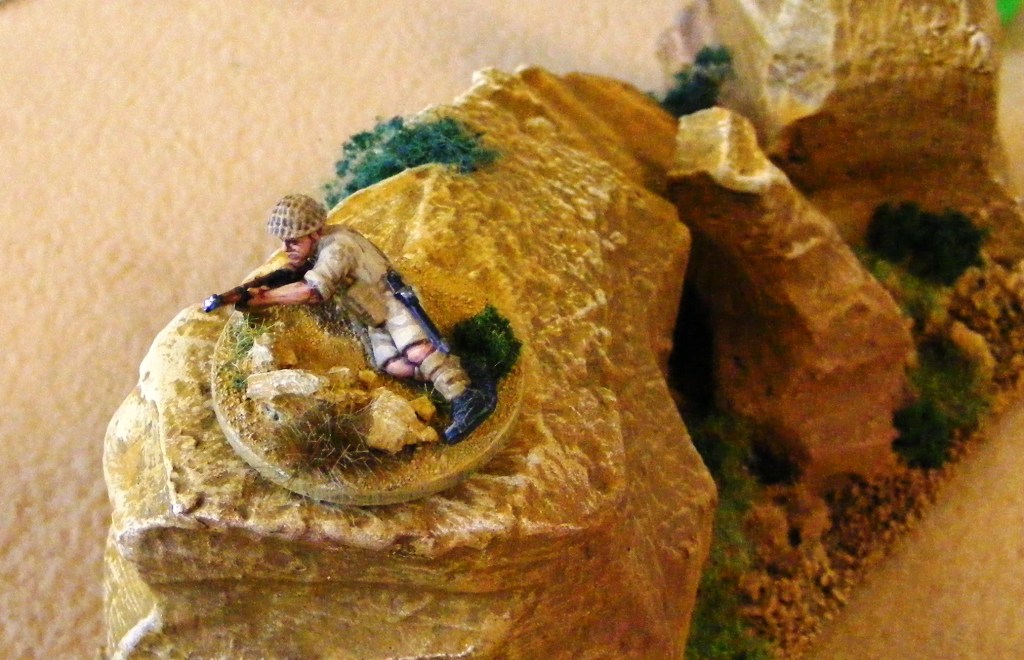 The British started with 4 infantry sections, a sniper and a 2” mortar on Brig’s Peak itself – their mission was to hold off the Italians until the end of the game. They were led by RSM ‘Basher’ Mactaggart (a Level 3 Big Man) and Lance-Corporal Jones, and also had a Forward Observer who could call up the fire of a pair of 3” mortars in support. All troops were rated as Elite, although each section had to take a dice roll before the game to see if it had already suffered any casualties; I got off very lightly, only taking a few points of Shock.
