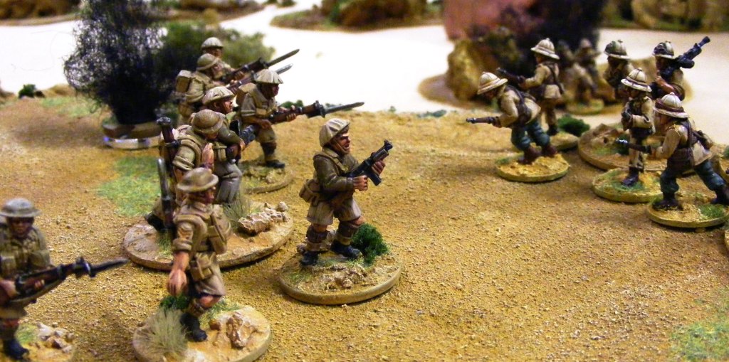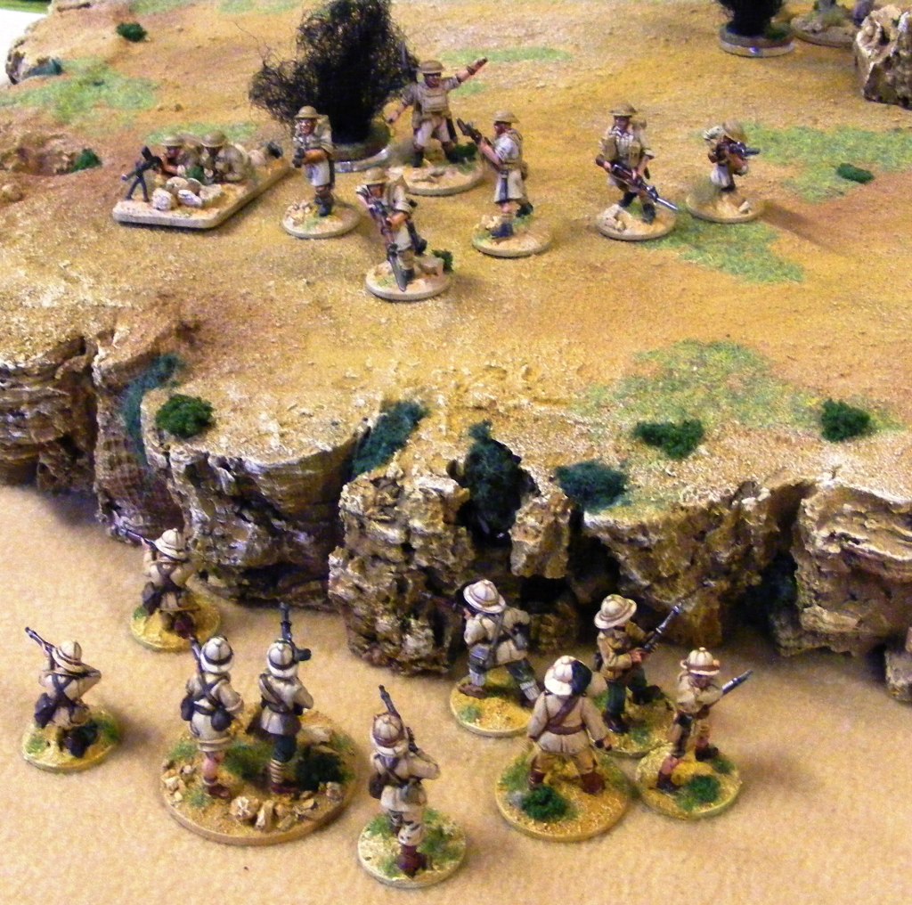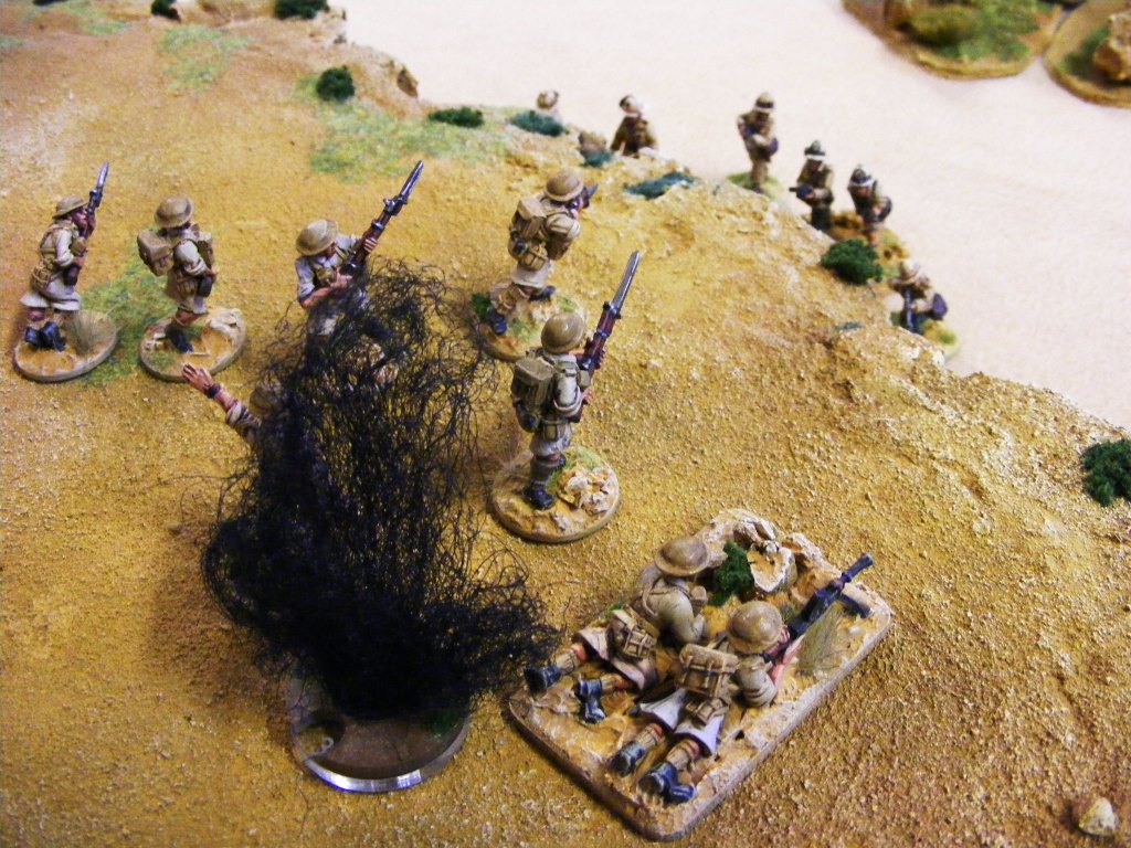 The firefight continued across the battlefield and, as the turns rolled on, the Italian numbers began to tell. My section deployed on the left was in good shape and was being well-supported by the 2” mortar team at the rear of the peak and the two Big Men; however, the Italian MMG chewed up the sections holding the front of Brig’s Peak, and the Italian Tenente ordered an advance on the Italian left and centre. RSM Mactaggart was about to rush back to rally his men, when he tripped over a rock and was forced to stay put! Fortunately, the British FO had managed to call up the 3” mortars and caught an Italian unit with the first salvo, causing no damage but pinning the section.