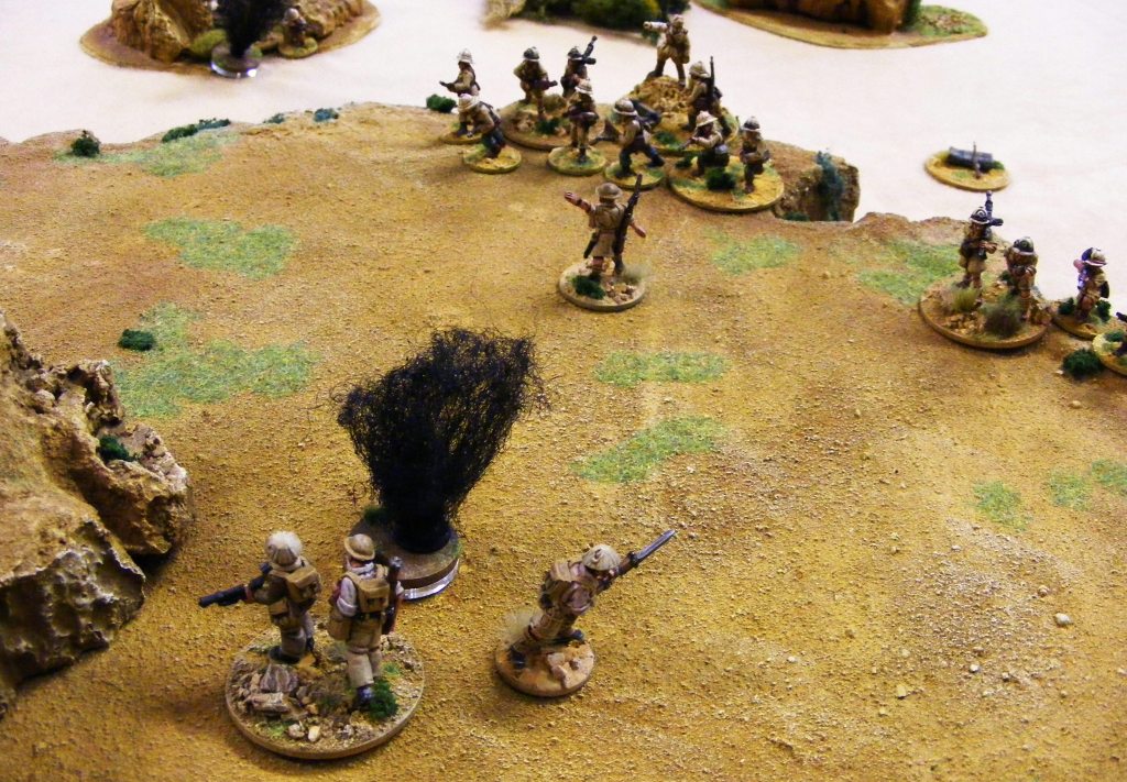 The battle started with a hail of fire from the Italian mountain guns deployed on the Italian right – despite the cover of Brig’s Peak, the British units took a number of hits. Not for the first time, lucky dice rolling on my part meant that casualties were minimal, and my British sniper got the gunners’ heads down with a number of Shock points caused by his sharpshooting.