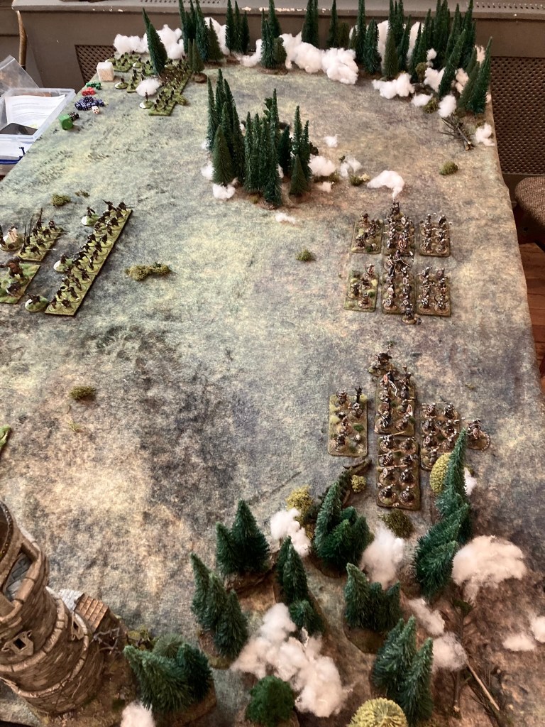 Terrain-wise, we used a Cigar Box mat (mine is a long pile version that is sadly no longer available) with a variety of coniferous trees that I found on eBay and rebased serving as the mountain woods. The mist is just soft toy stuffing (bought in a bag from a craft store – NOT extracted from mercilessly-hunted teddy bears!) For a bit of extra set dressing, I used a scratchbuilt watch tower from my collection as well.