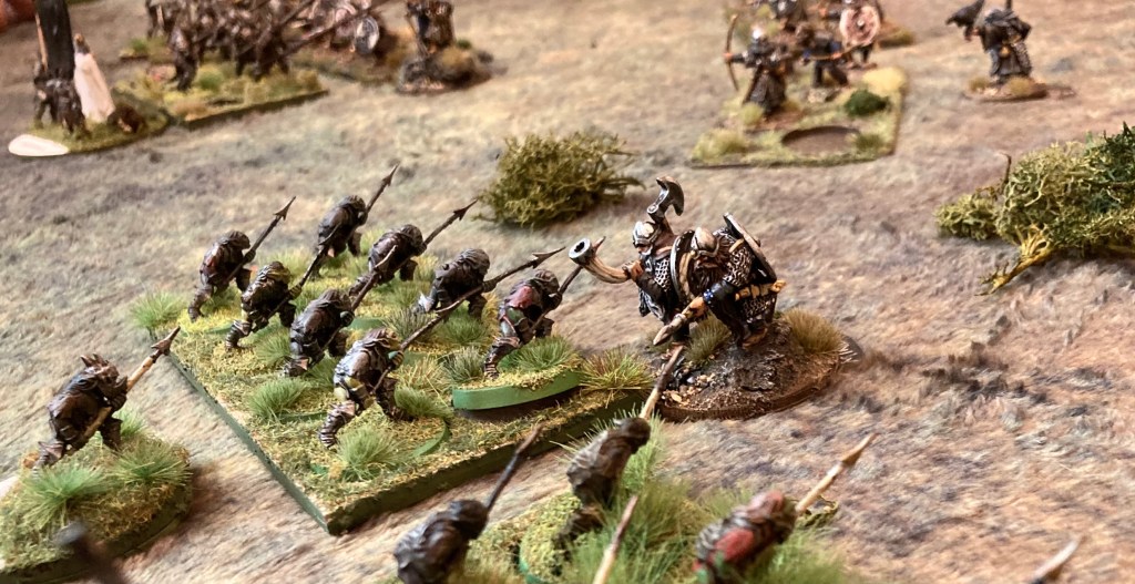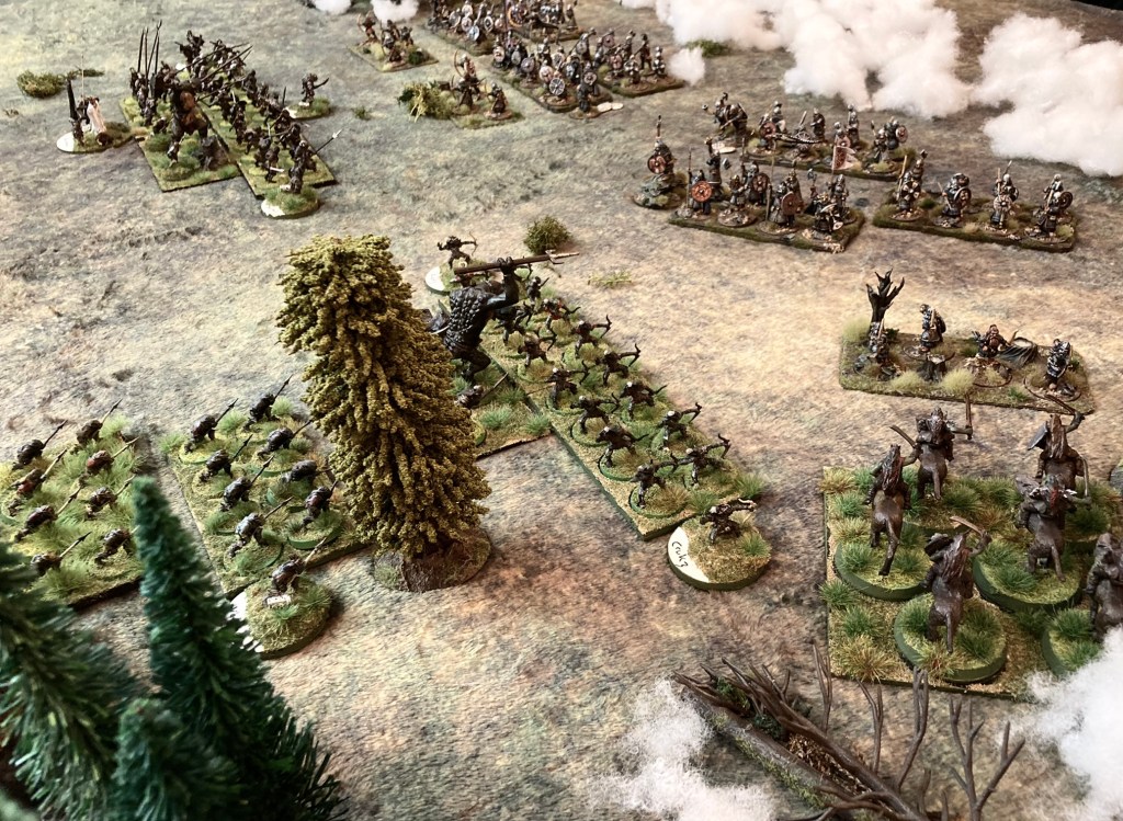 I was very fortunate in that only one of the Dwarven battles deviated slightly from my planned deployment, but the Orcish left and right battles got completely lost and veered off to the far right and left of the battlefield. Better still, both groups had units in the woods, which would create further command and control problems as the game started. The Dwarves were, so far, in the pound seats and looking forward to a fast advance to crush Saruman and the Orc centre before the wings recovered. Well, that was the plan!