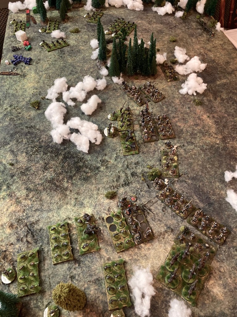 I was testing out a new scenario called ‘Encounter in the Mist’ that actually had its origins as a Wars of the Roses Battle of Barnet game that we played last year (you can read Tom WD’s account of it on his blog here). The key principle was the same: creating confusion! We deployed the armies in three ‘battles’, then diced for each one to see what had happened to it in the fog.