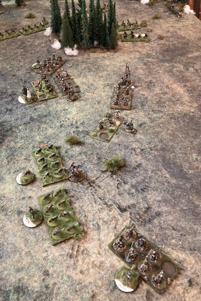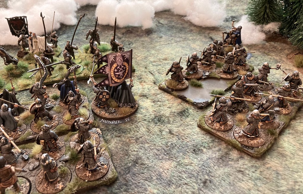 Part 1 of the plan went pretty well: the well-disciplined Dwarves moved up without too much trouble, whereas the Orc captains in the woods suffered merry hell trying to get their hordes moving! (It was quite fun watching Pete cursing away). Midgard uses a very simple command test, but it becomes more complex if you have reluctant troops, especially if they’re in rough terrain. Oh yes, and the mist made it harder to pass the command test too. Laugh? The Dwarves were certainly having a chuckle in their beards.