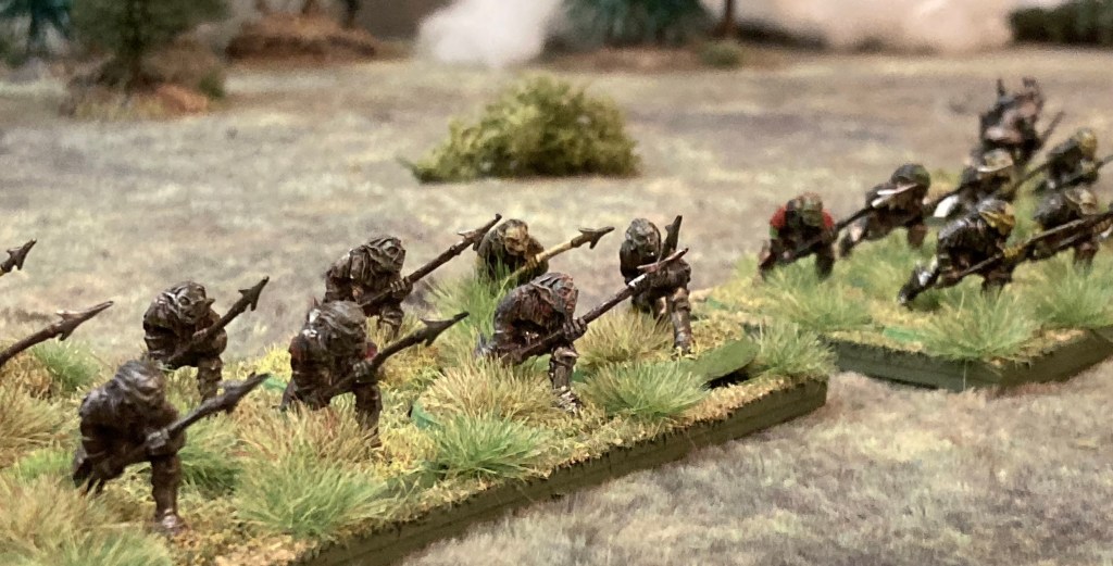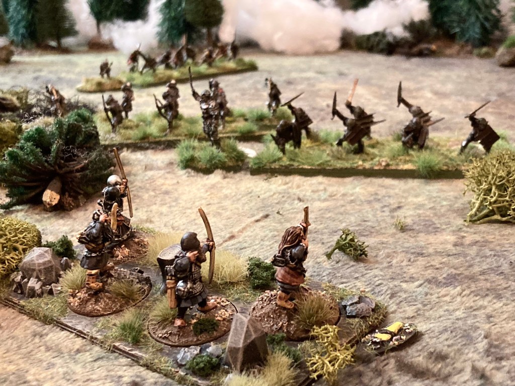 However, the mist worked against the Dwarves as well, reducing visibility to just a single Spear Throw (the unit of game measurement). This meant that the archers had to hang back, and let the Orcs get the first charge in. I can’t blame the mist for the terrible dice the Dwarves rolled in the first round of combat, but suddenly they found themselves being driven back by a horde of Orcs.