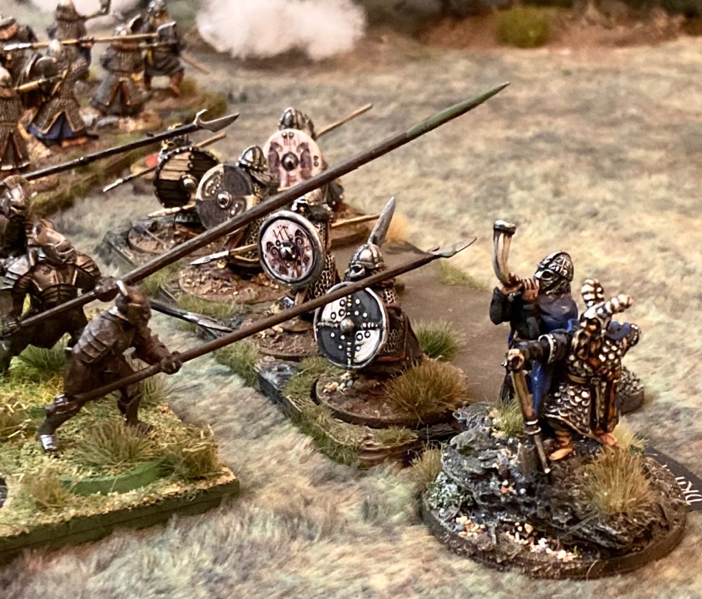Dwarf lords Nundir and Drifir, both wounded, were still locked in combat with Saruman’s Uruks in the centre, but had failed to land a blow on the white wizard.
