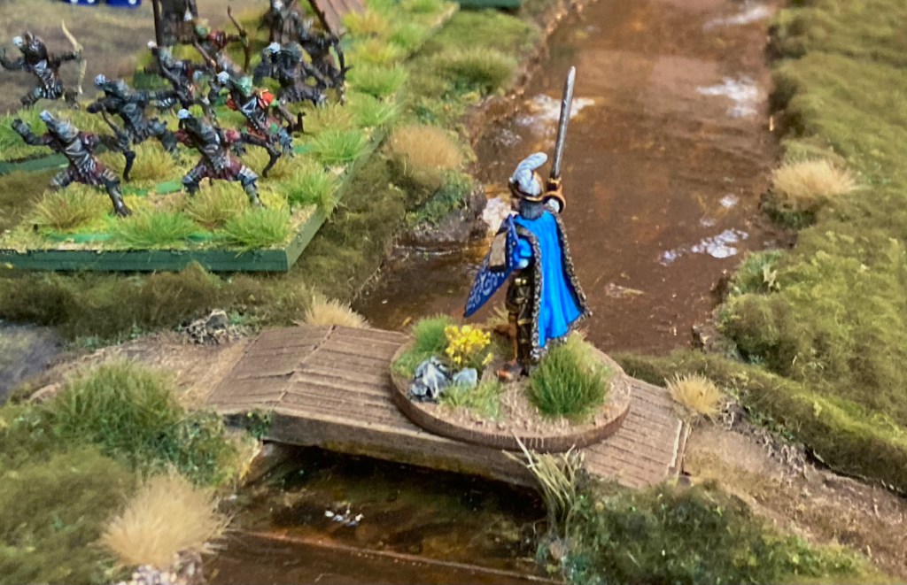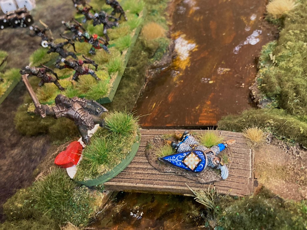 Despite Elrohir’s higher status, Ugluk got the first blow in and wounded the Elf (shockingly bad dice rolling by yours truly!) Things stabilised in round two, with honours even, but the third round of single combat was one round too many! Both champions struck a wounding blow, which doomed Elrohir, dropping dying to the boards of the bridge.
