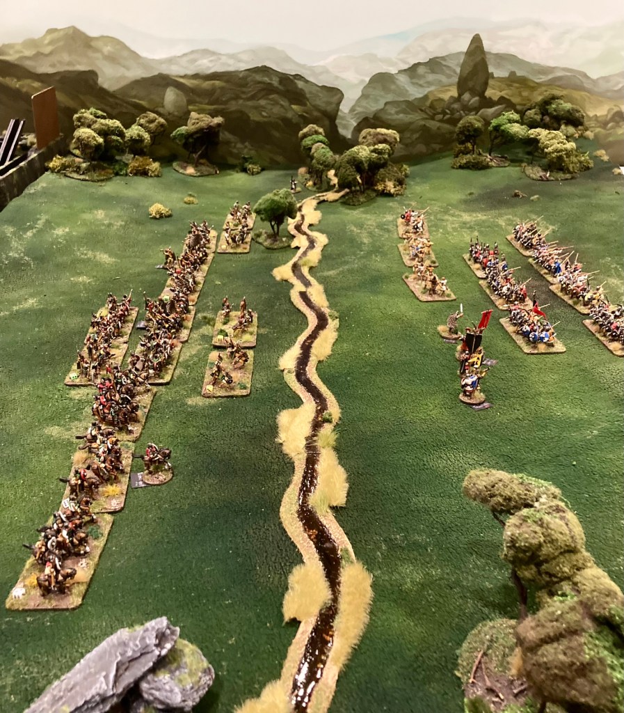 The 15mm Battle of Degsastan game proved unexpectedly popular with both Pete and Andy doing sterling work running games for interested players during the day. We were graced with a visit from Dan Mersey who was pleased to see his 18mm Wiglaf Miniatures in action and to hear Immigrant Song blasting from the rainbow bridge!