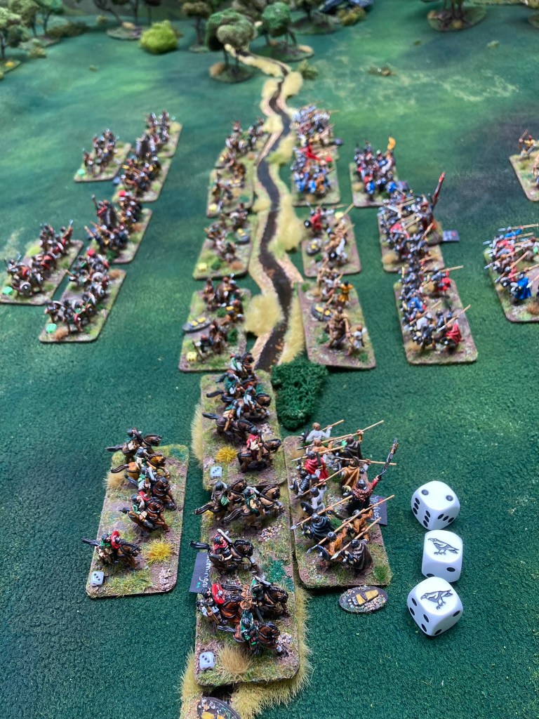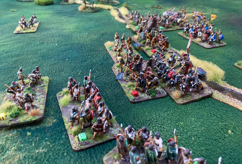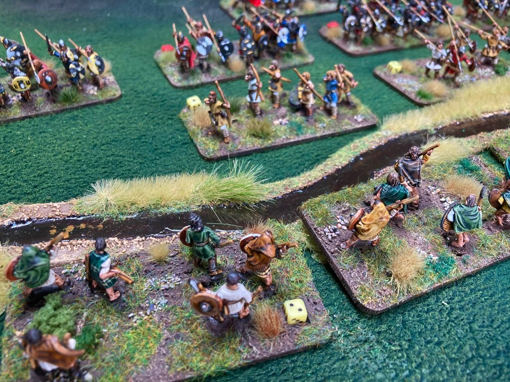 The Saxons have secured their left flank (bottom) and are holding firm in the centre having crossed the stream