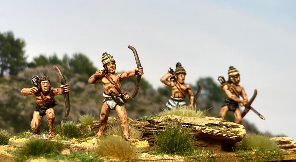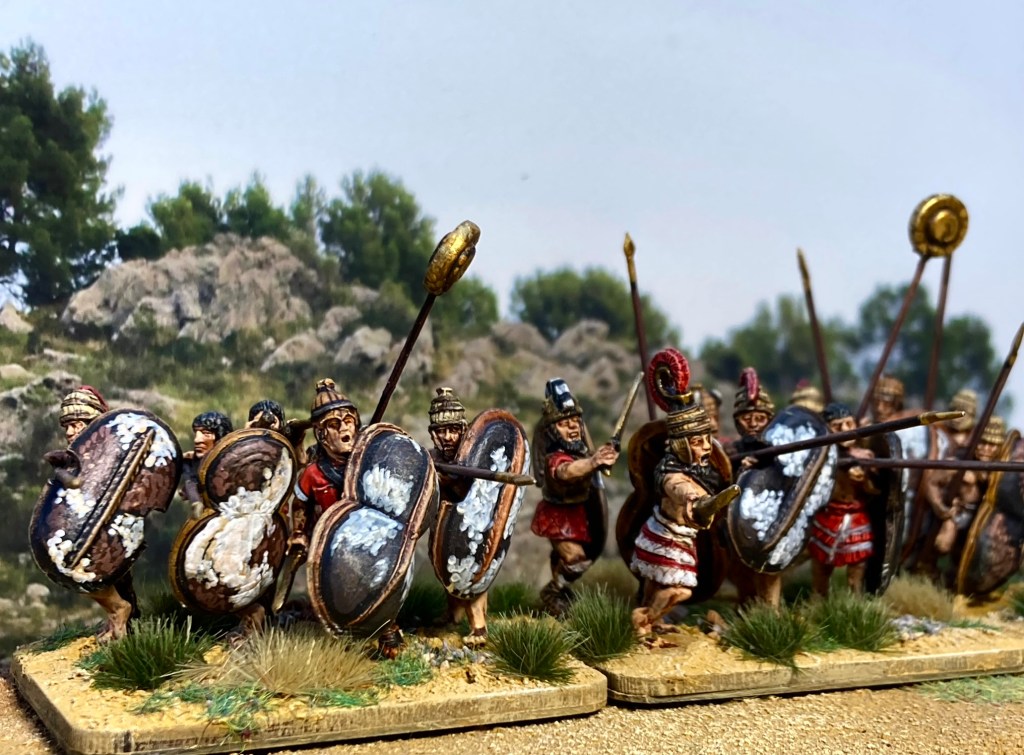 They’ve been colour-coded to an extent with red tunics and plumes and I’m rather pleased with the cow-hide shields, which I’m finding incredibly therapeutic to paint!