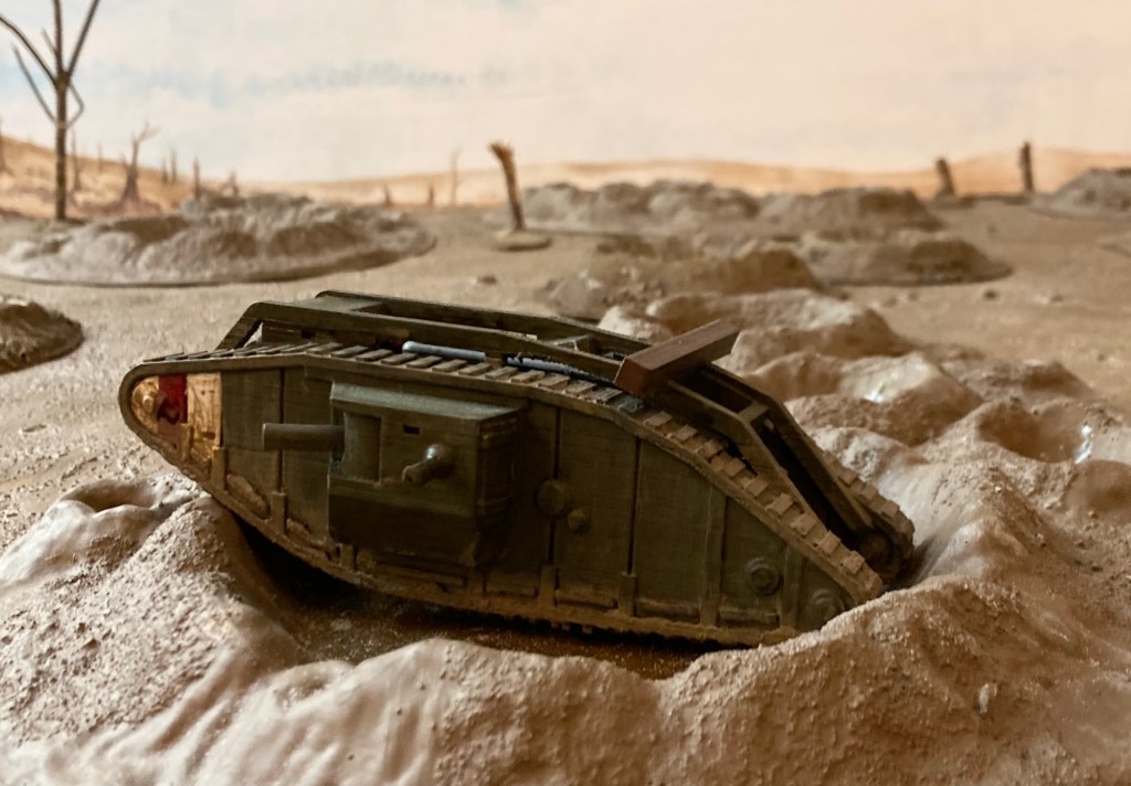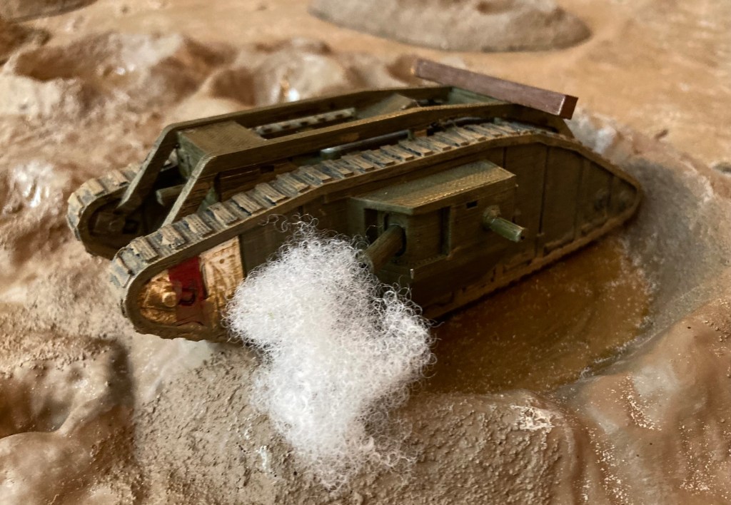 Fray Bentos sits ditched in a shell hole: 3d printed Mk IV male tank (unknown designer), craters by Kallistra, rest of terrain scratch built by myself and Scrivs.