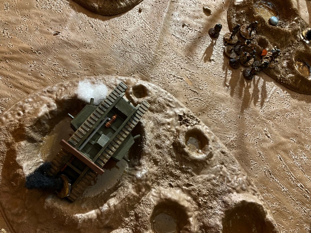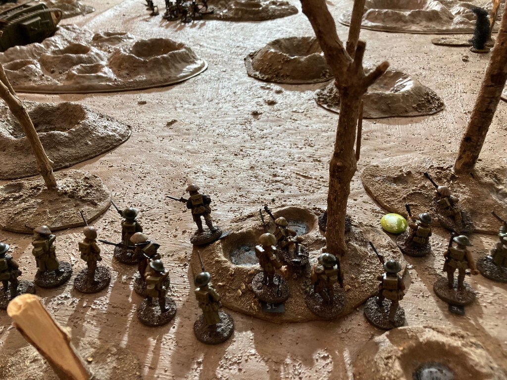 Fray Bentos was deployed stuck in a crater in the centre of the table, permanently immobilised for purposes of the game, but able to carry on shooting. I also gave the tank a Senior Leader to represent Capt Richardson and – somewhat impetuously- a red dice to reflect his leadership during the crisis of August 22-24 1917. (A red dice counts as an extra Command Dice in Chain of Command, but only for activation purposes. Scores of 5 and 6 are ignored).