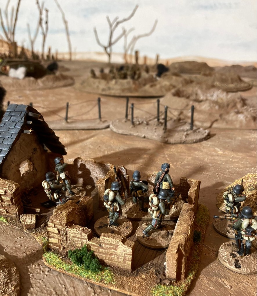 The Germans had some anti-tank capability with an additional bomber section. Both bomber sections had bundles of stick grenades – but would have to get close to use them. I toyed with the idea of giving the Germans a tripod-mounted MMG as well, but decided against it, as I wanted the tank to come under attack at close quarters, as originally happened.