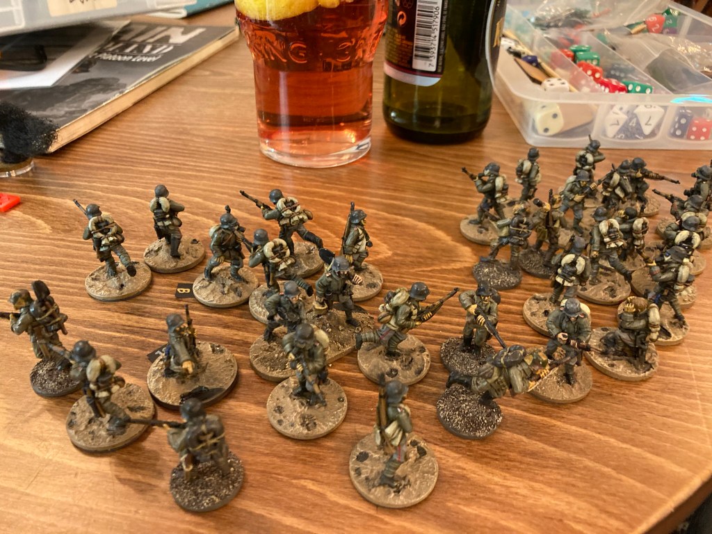 I knocked up a quick scenario for Chain of Command with pre-set jump off points to save time (just as well as many of us arrived late at the pub where we game and then had a long wait for food). Both Germans and British had a standard 1917 platoon each (with stats taken from the ‘CoCing up the Mud and Blood’ article from the Lard Winter Special 2014).