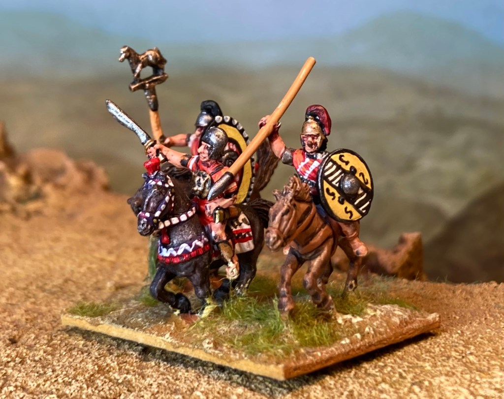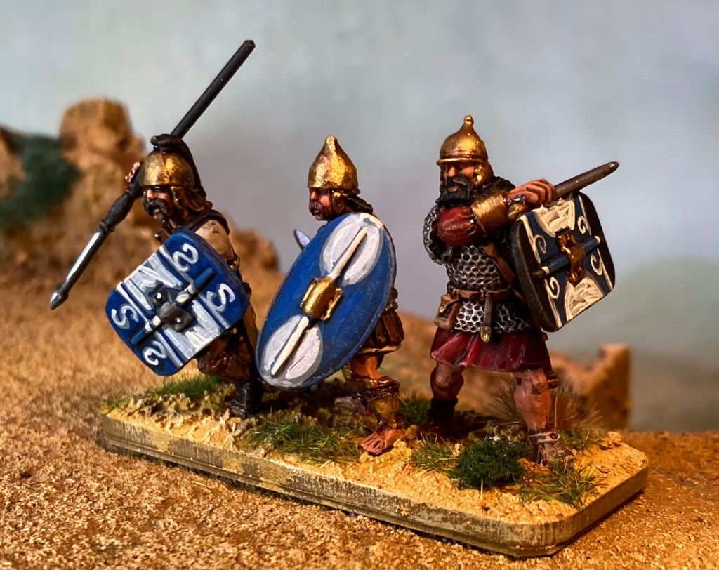 Here’s a few close-ups including a couple of 40 x 50 mm vignettes that are built into my units. The shields are all based on pictorial evidence (painted pottery etc) with some artistic licence – I basically took the visual sources and used the design elements to create designs involving stripes, curved lines and spirals. Having practised on a whole 15mm army, it was definitely an easier process second time around.