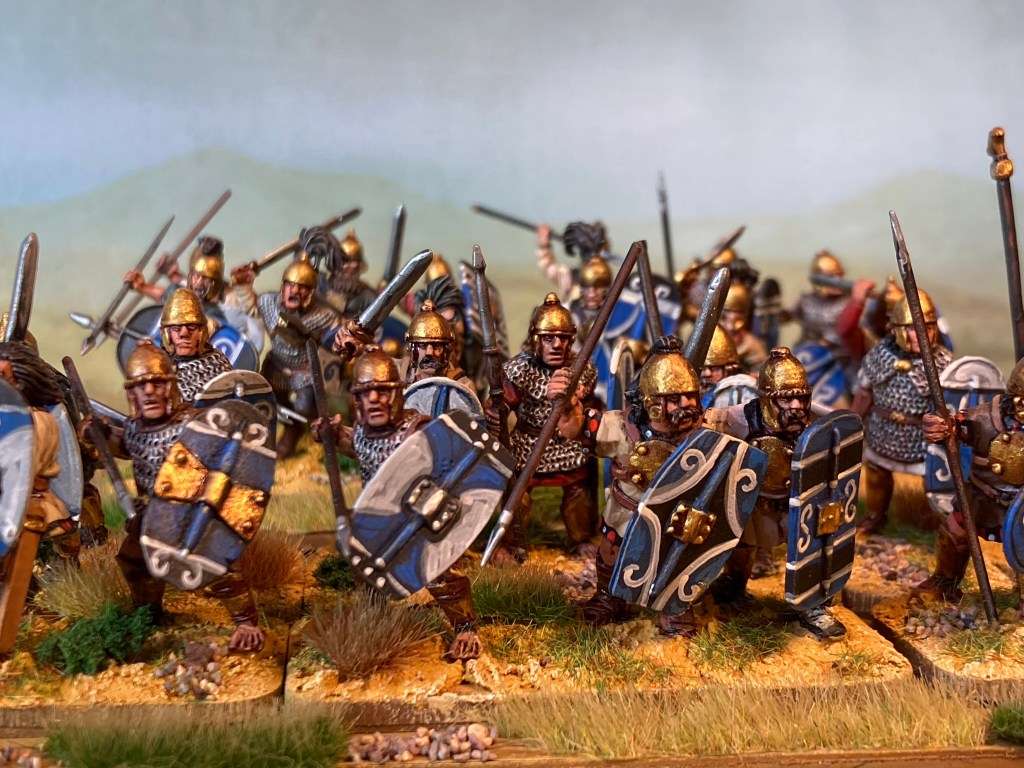 These chaps – often referred to as ‘scutarii’ by Roman sources – are the backbone of the army. I ended up collecting about 90 (organised into seven units of 12 in the pics below).