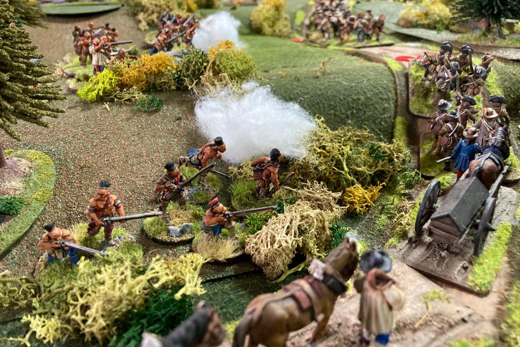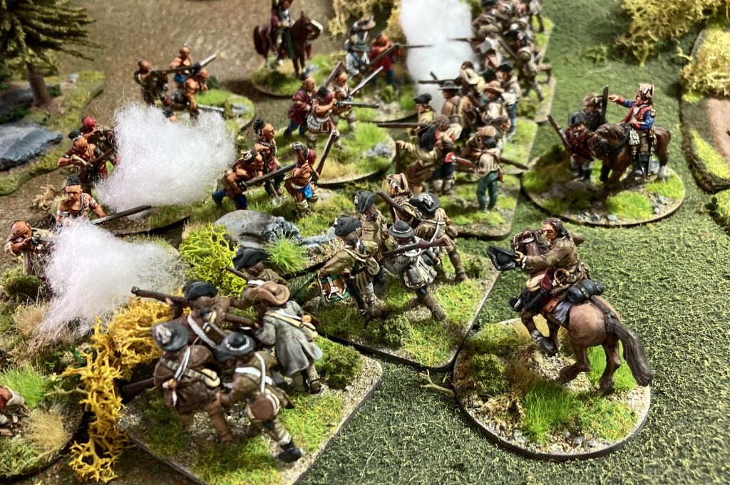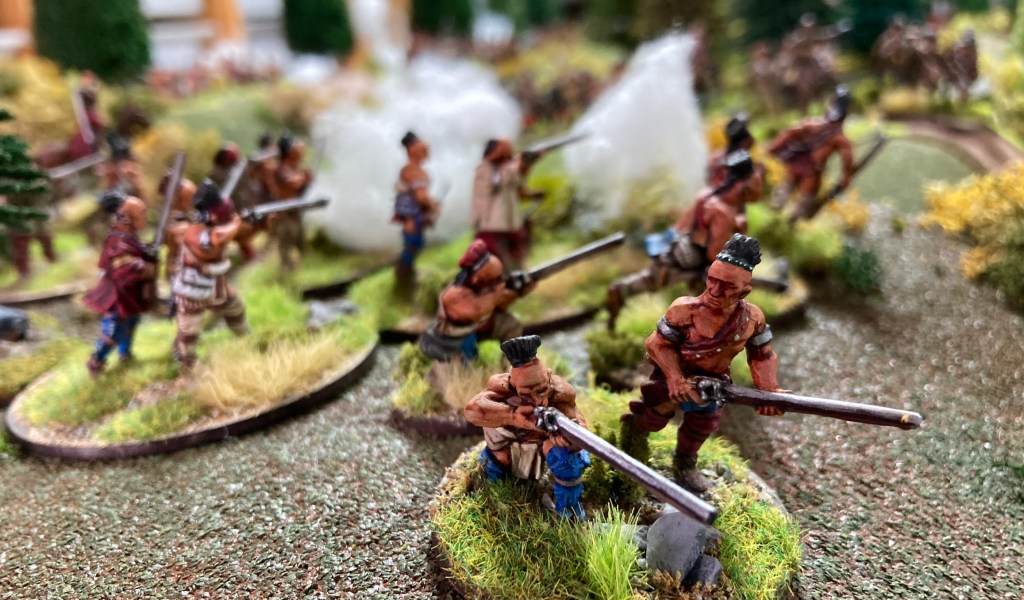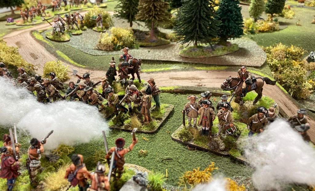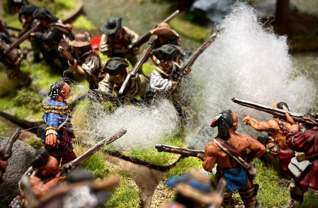 Having escaped the first volley, Colonel Cox rapidly rallied his militia and turned them to face the threat from both The Mohawks and a few British units that had deployed at the front of the column.
