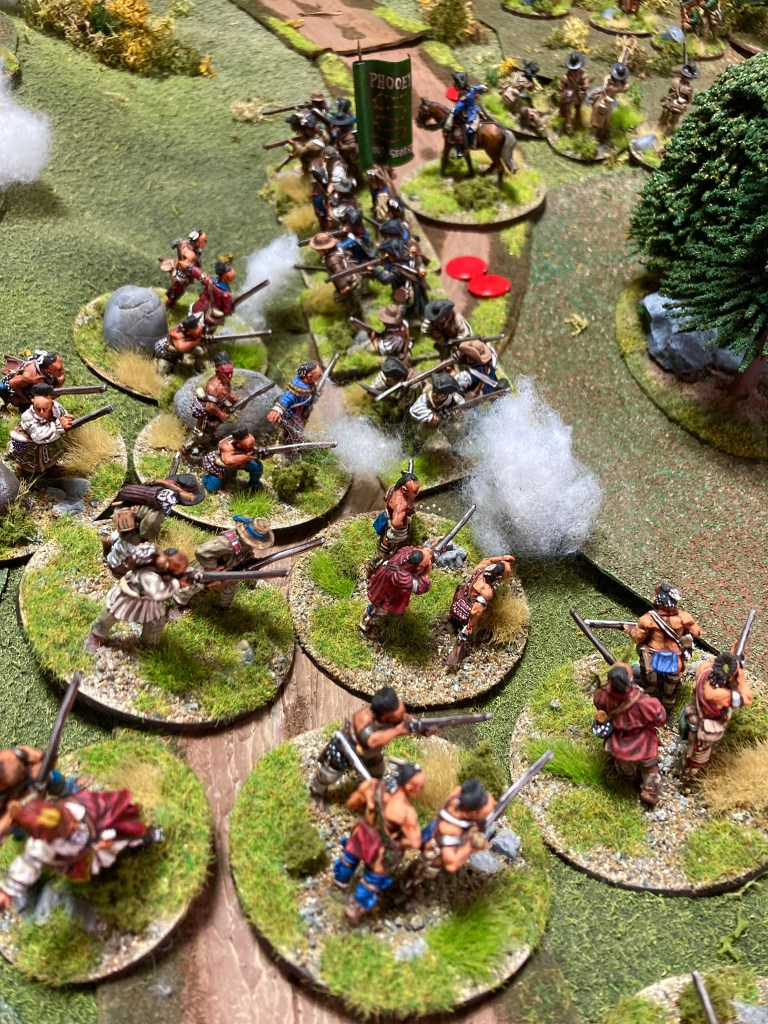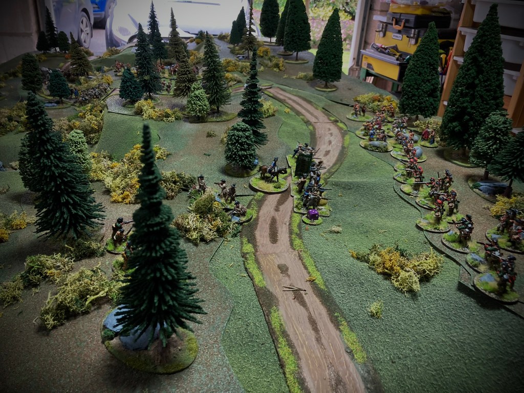 Steve and I were playing in a fairly narrative fashion, with both of us moving and dicing for different sides in different parts of the game. Once the ambush had been sprung, I had a free choice of where to place the Crown forces and went for uphill of the Rebels, both for the height advantage and to avoid getting caught in the loop of the military road.