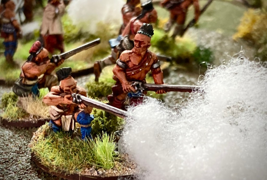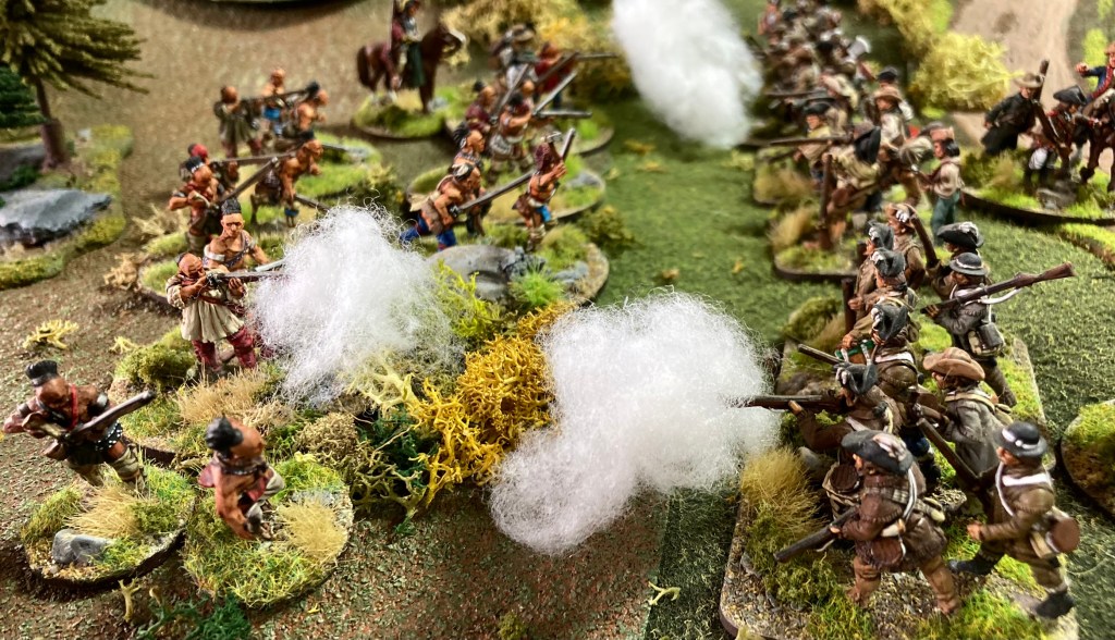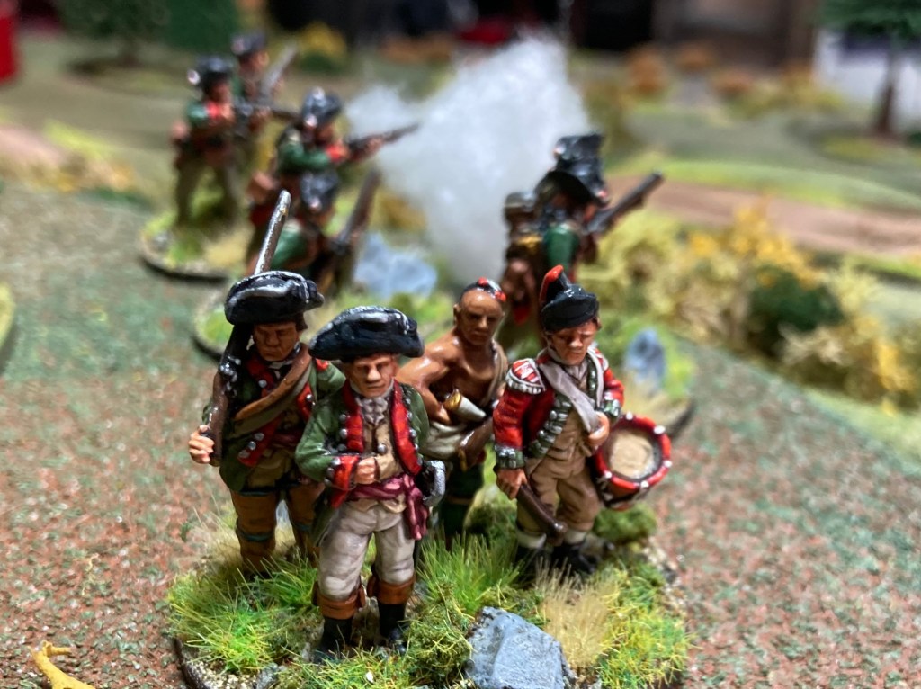 Joseph Brant’s Mohawks were the first to appear, with a couple of large units manifesting themselves uphill of Colonel Ebenezer Cox’s Tryon Militia and opening fire at very close range.