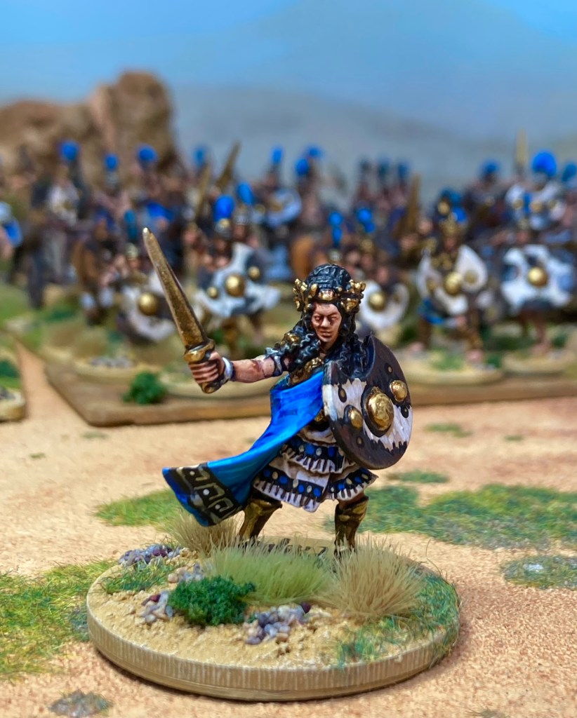 And so, the following morning, with a blast of bronze trumpets, the Scaean Gate opened and disgorged a horde of Amazons. Sun glinting on their helms and arrow-tips, Penthesilea led her warriors to meet Diomedes of Argos, first out of the Greek camp. A single combat was agreed between Podarces, brother of Prothesilaus (the first Achaean to be slain in the campaign) and the Amazon champion Bremusa as the others rushed to battle.
