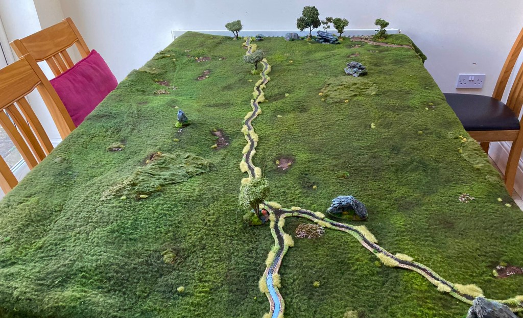 The battle was fought at Degsastan, ‘Degsa’s Stone’, an unknown location in Northern Britain in 603 (or possibly 604). Peter Marren’s book Battles of the Dark Ages presents the evidence for the most likely site being Dawston Rigg at Liddersdale in the Scottish Borders (there are other options but for simplicity I just followed his lead.) Guy Halsall’s article for Miniature Wargames magazine in the 1980s included a suggested map of deployment (reproduced in Peter Marren’s book), with the two opposing forces facing off across Dawston Burn, so I took this as my blueprint for the game. Historically, the battle was a mighty victory for Aethelfrith of Bernicia and paved the way for the Saxon domination of the north of England.