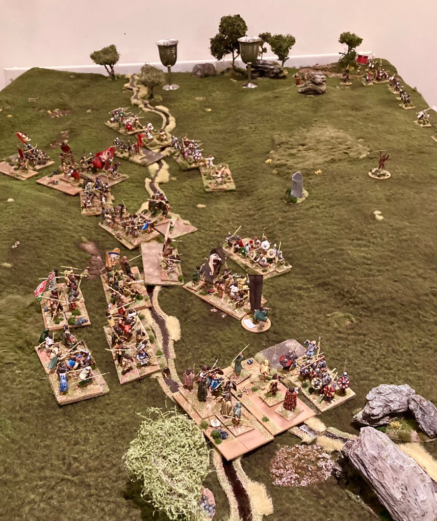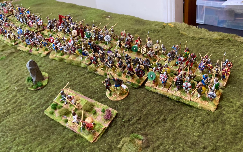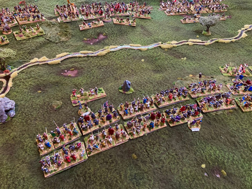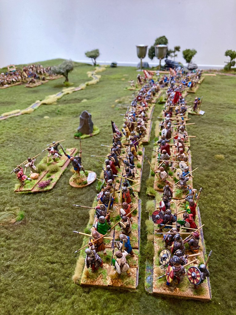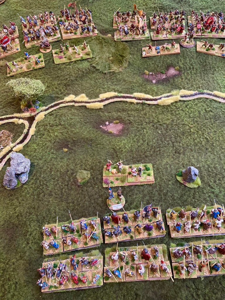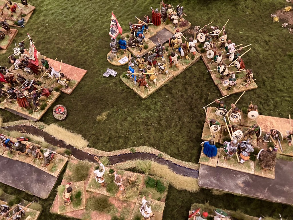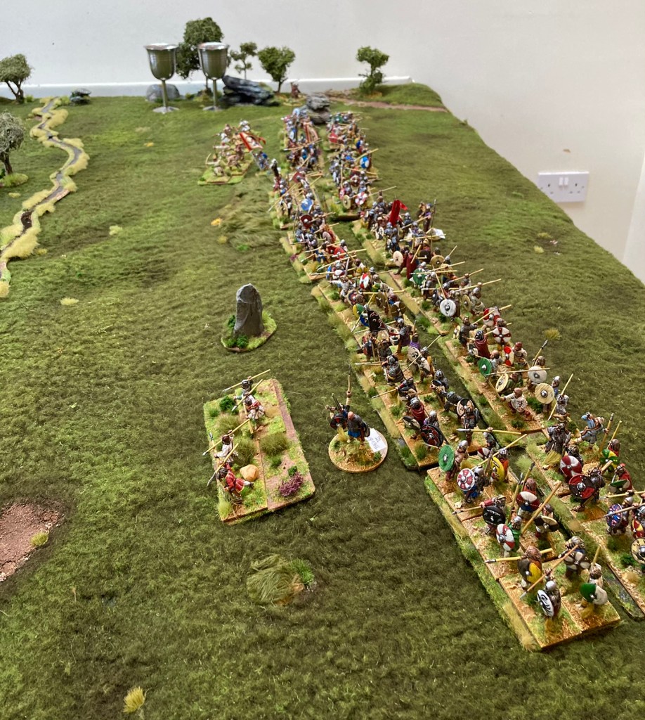 The forces array for battle across Dawston Burn, with Degsta’s Stone in the centre. Saxons at bottom, Dal Riada and allies at the top.