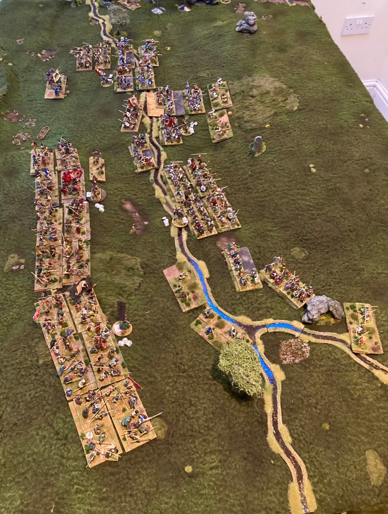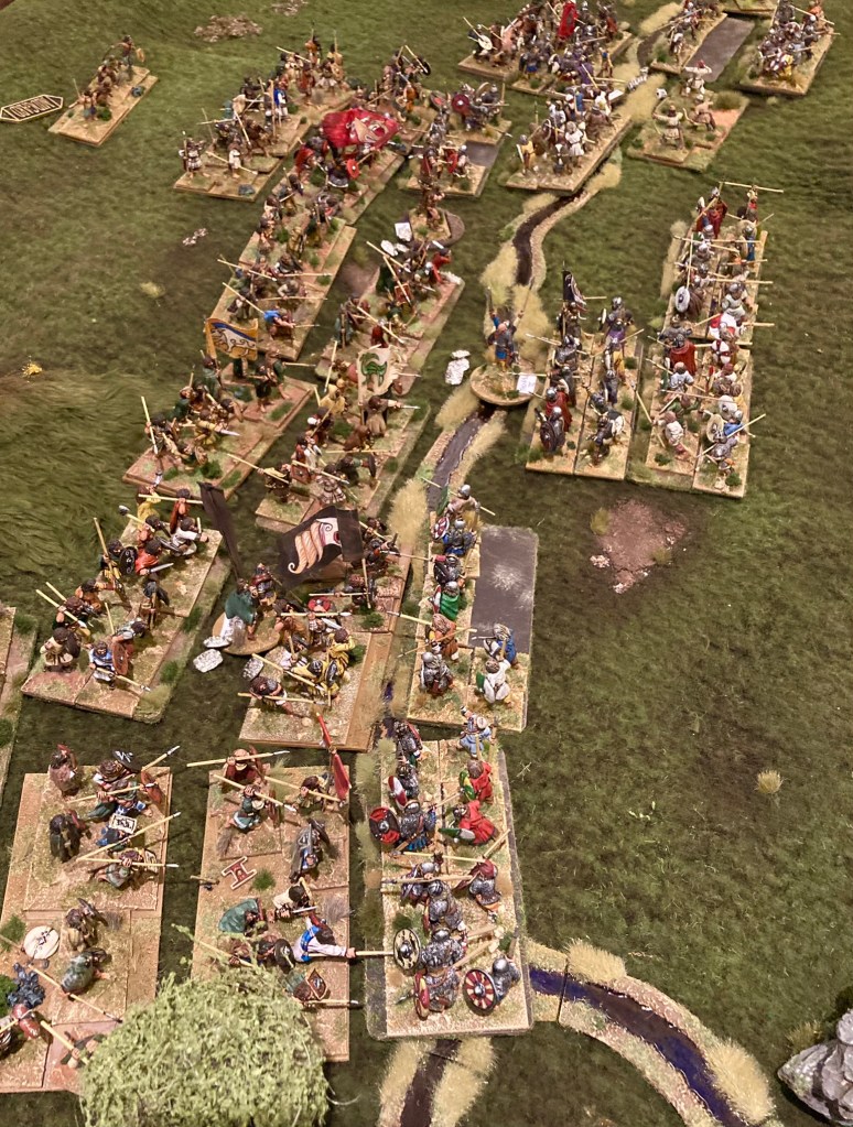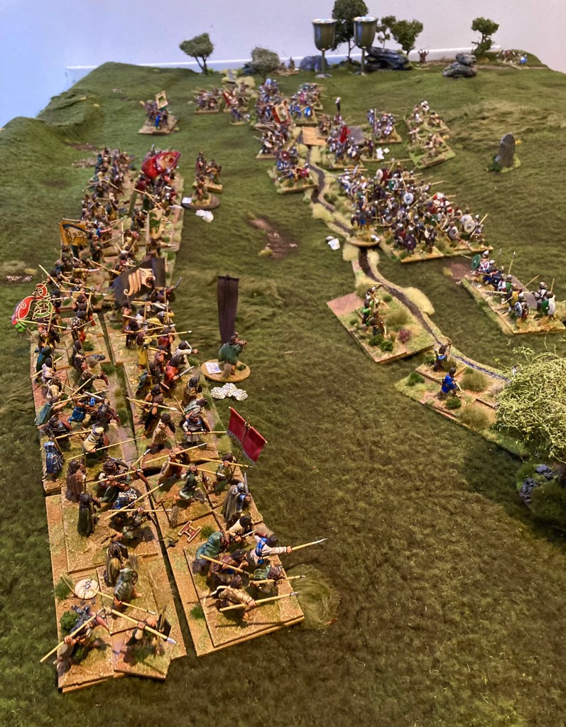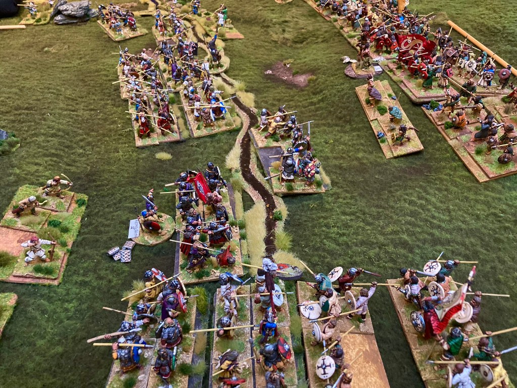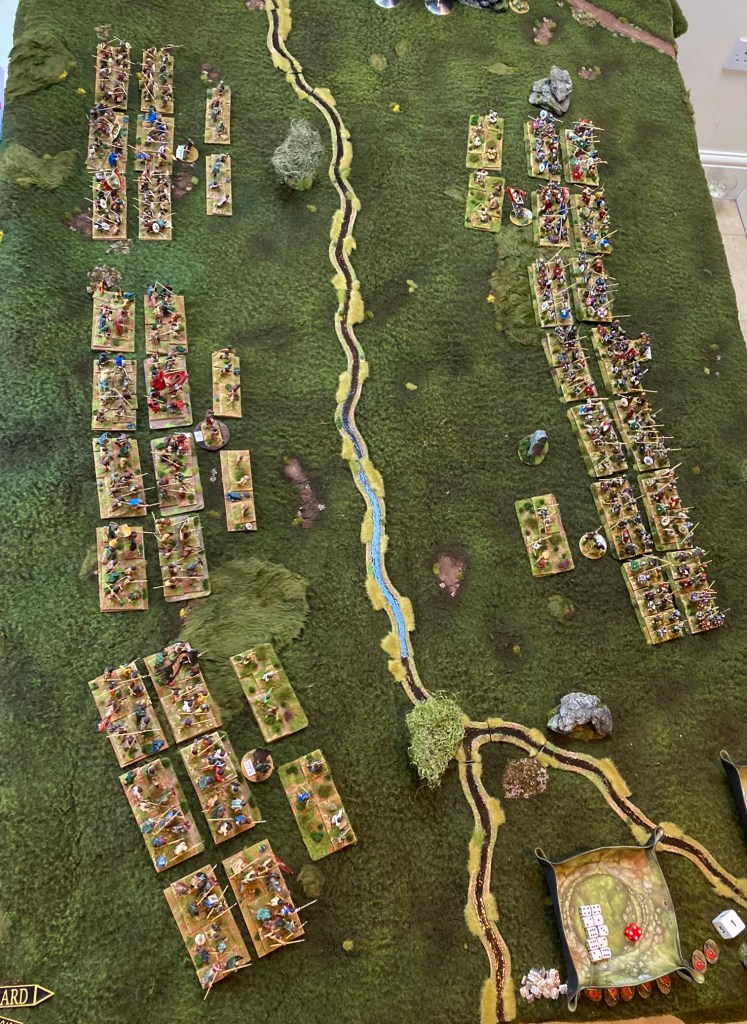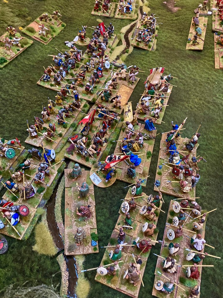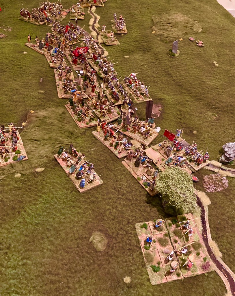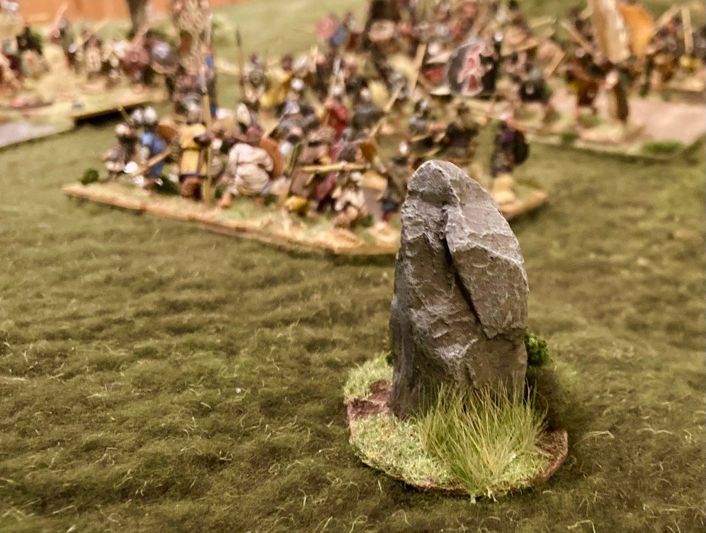 The forces array for battle across Dawston Burn, with Degsta’s Stone in the centre. Saxons at bottom, Dal Riada and allies at the top.