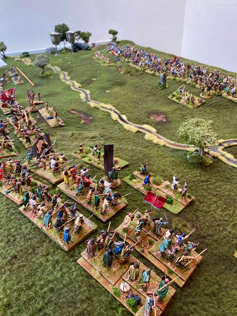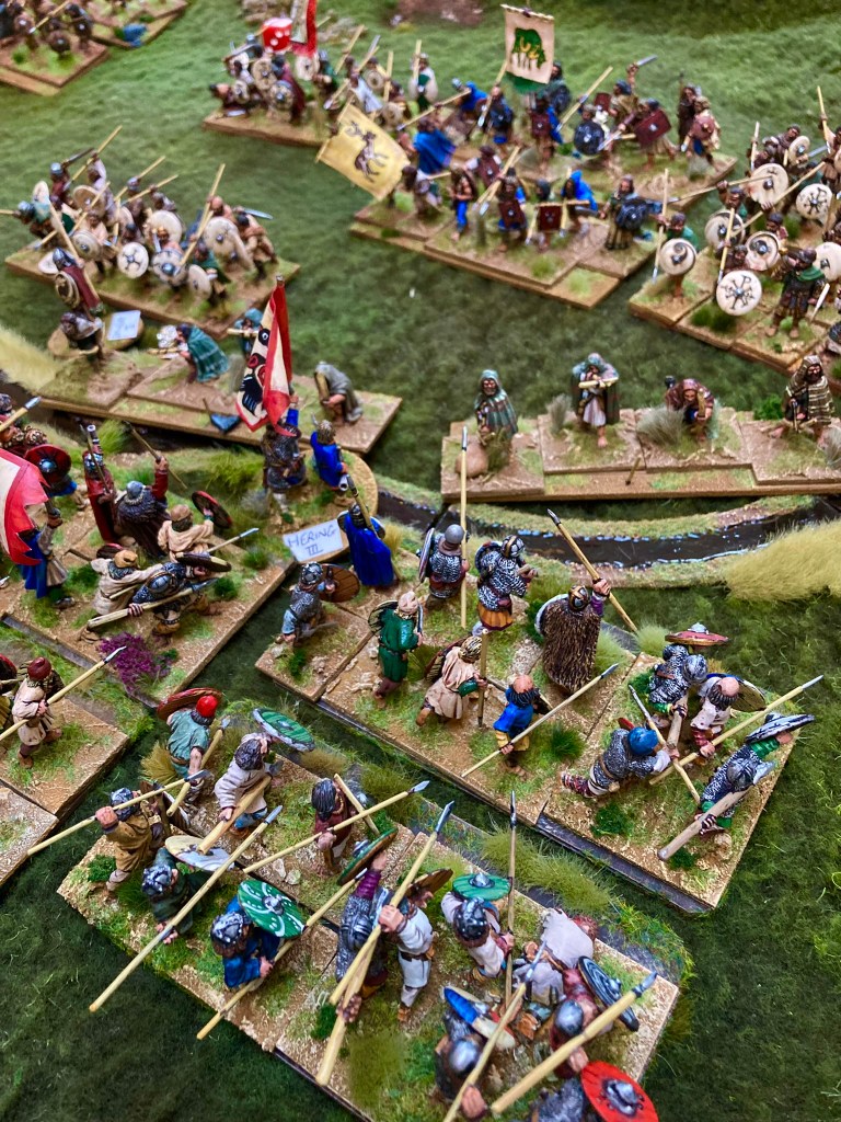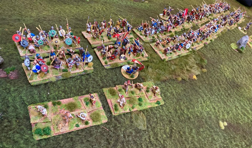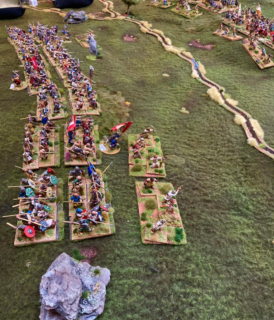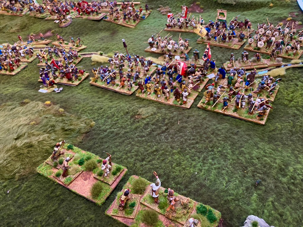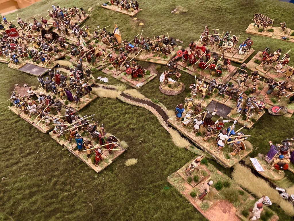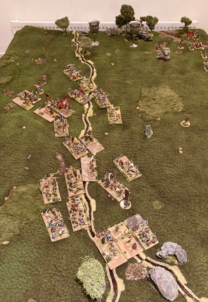 The forces array for battle across Dawston Burn, with Degsta’s Stone in the centre. Saxons at bottom, Dal Riada and allies at the top.