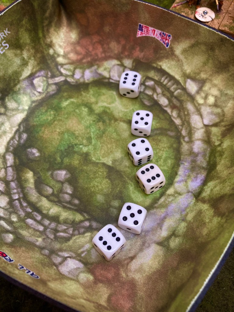 When you roll dice like this, those skirmishers are going to cause trouble! Dice tray from Handiwork Games