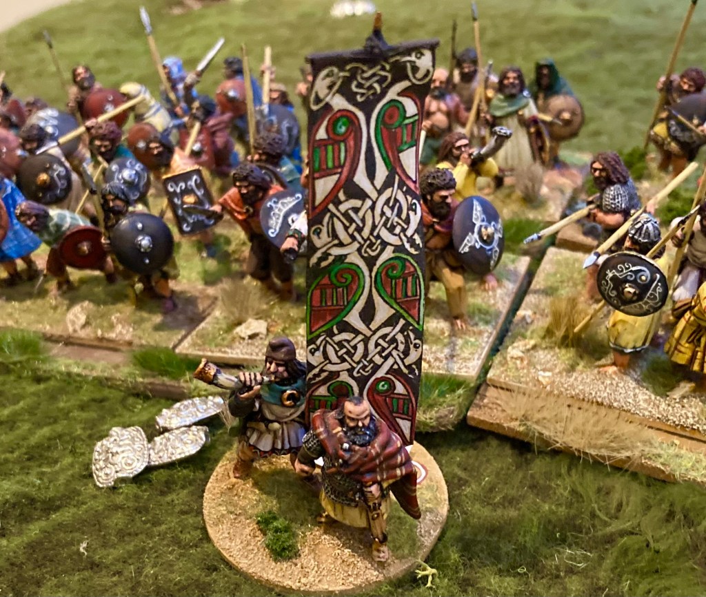 Irish King – a wonderful miniature sculpted by Duncan Patten for Gripping Beast, based on the Angus McBride painting. Flanking him are a banner bearer (a Colin Patten sculpt from GB) and a horn blower (a Pict from Black Tree Designs)
