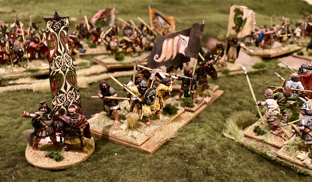 We muster at dawn! The Irish come out to fight. The King is a heavily converted Gripping Beast figures carried on his shield by two figures from the Alternative Armies Erin range.