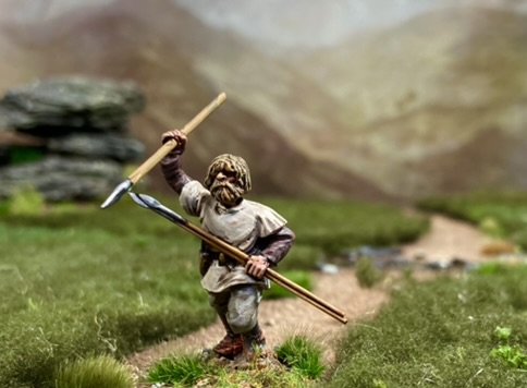 Clubs, stone weapons and spears are the weapons of choice along with wicker shields, portraying a culture with little metal-working, which fits nicely with the concept of a Stone or Bronze Age society being supplanted by invaders wielding iron weapons. (I think an alternative portrayal could make use of the Foundry Bronze Age Europeans, but that’s a project for another day).