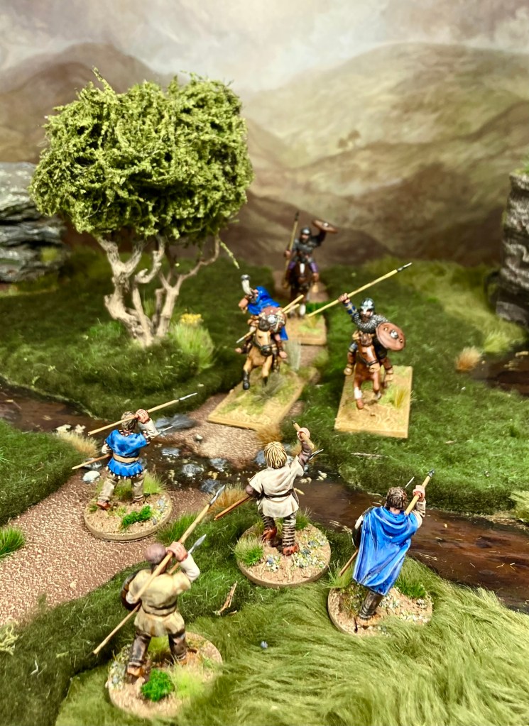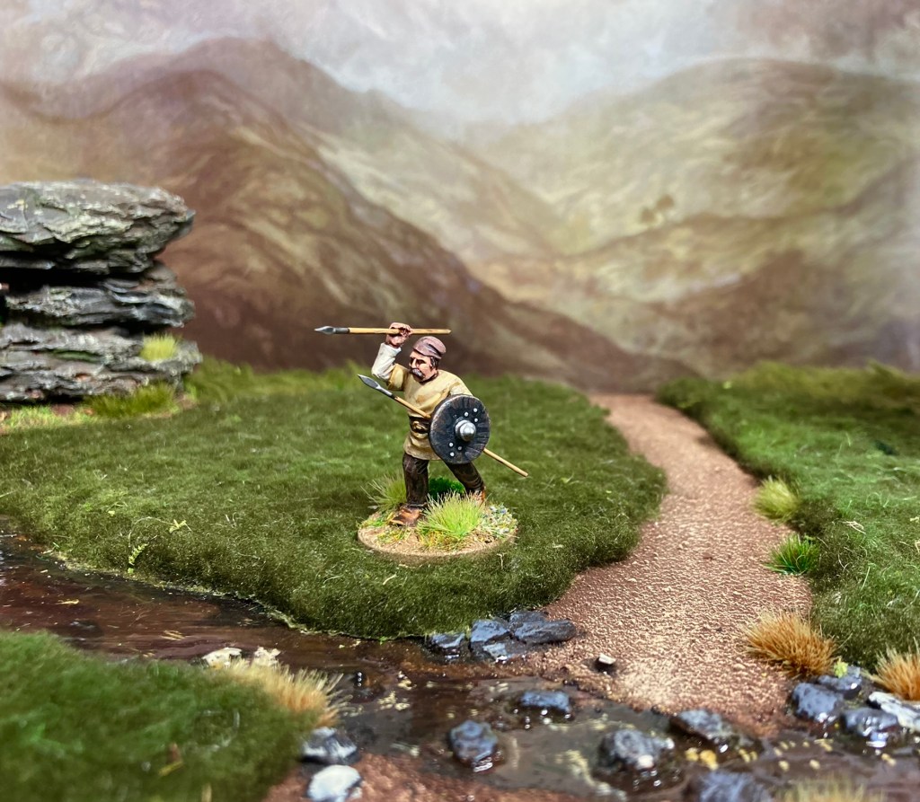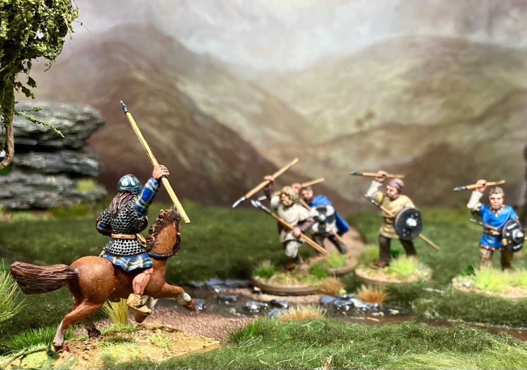 Pictish king – two Gripping Beast models with a hornblower from (I think) Old Glory. I always liked the idea that the ‘broken arrow’ Pictish motif might be a protective symbol so I painted it on the king’s shield.