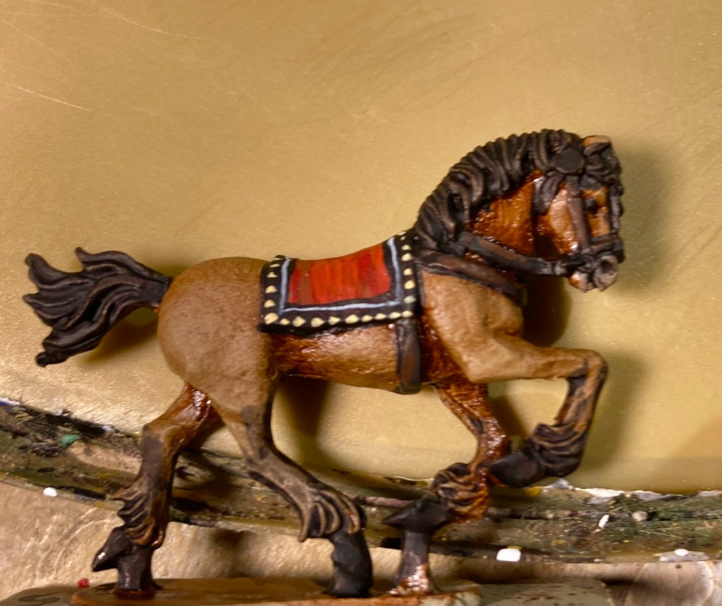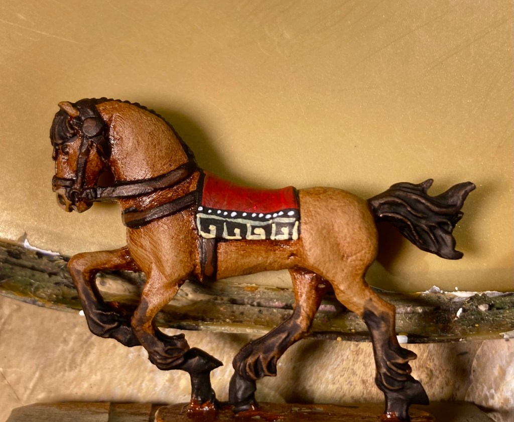 Horses also featured in the colour scheme, with co-ordinated blankets. The horses used were a mixture of Lucid Eye and Foundry from the bits box, undercoated with sprays and then painted using an oil wipe-off technique (you can see a better breakdown of this with my Amazon chariots here).