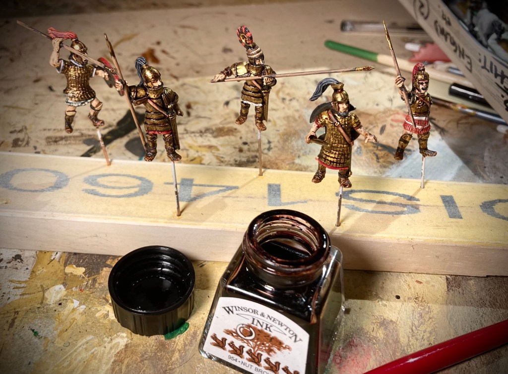 The bronze (my favourite part of the paintwork) is added after matt varnishing. After a basecoat of dark brown or black, I paint all the bronze with Vallejo Brass. This is followed up by a wash of Winsor and Newton Nut Brown ink and then a highlight of Vallejo Gold, with a tiny amount of Army Painter Sjining Silver on blade edges. As usual, I’m not looking to win any painting prizes, just trying to get some colourful minis onto the gaming table.