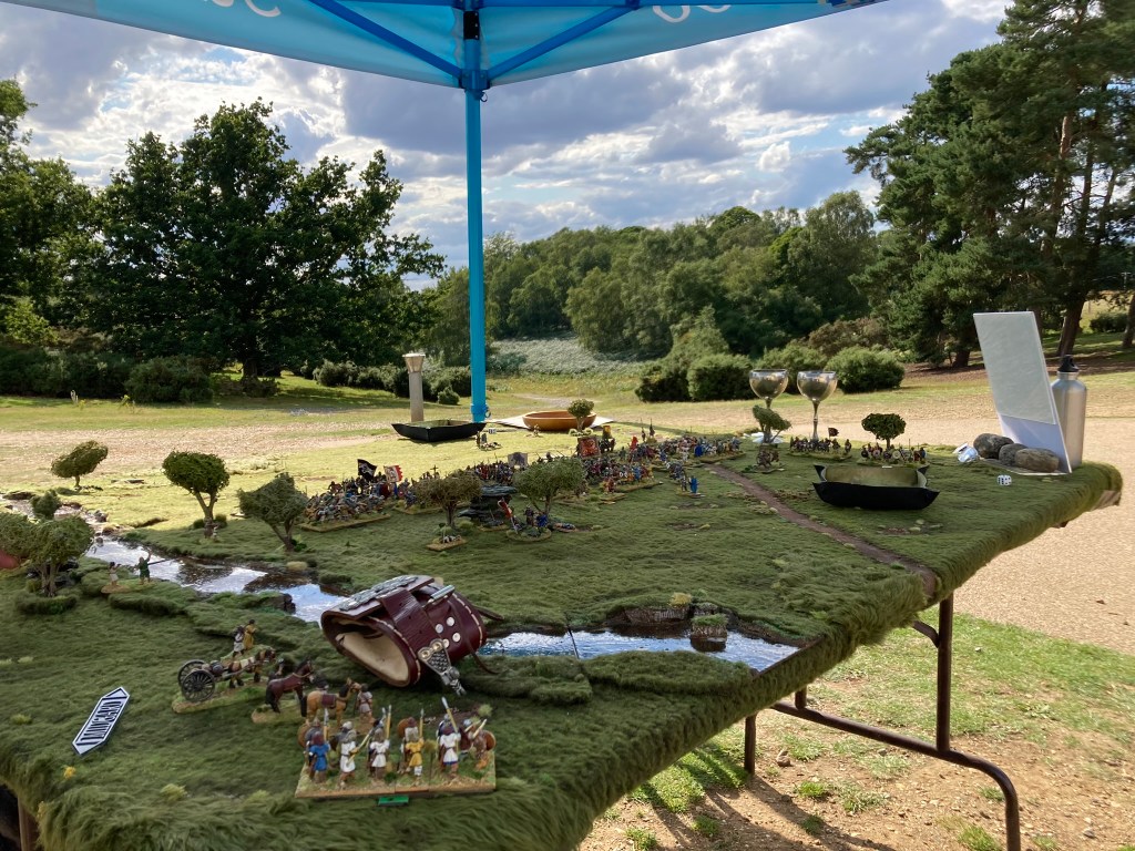 The game took place on a very smart custom-built board with a wooden frame which was ideal for withstanding the rigours of a participation game and the occasional high winds experienced at Sutton Hoo. Rules used were a simplified version of Dux Brittaniarum from Too Fat Lardies.