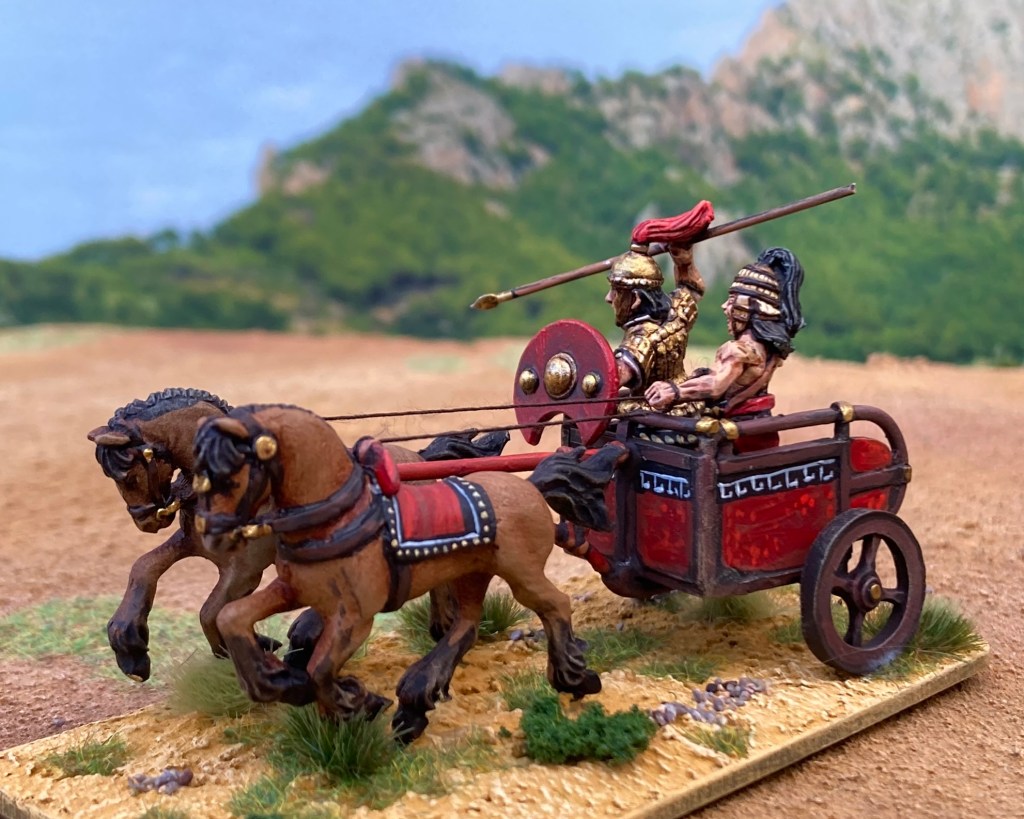 After completing a number of units of spearmen and Achilles’ Myrmidons, I needed some chariot-riding nobles to back them up. The disadvantage of having acquired various secondhand lots was compatibility of the models, and while I will usually happily mix and match between ranges, the Lucid Eye chariots are of far more heroic dimensions than the Foundry ones.
