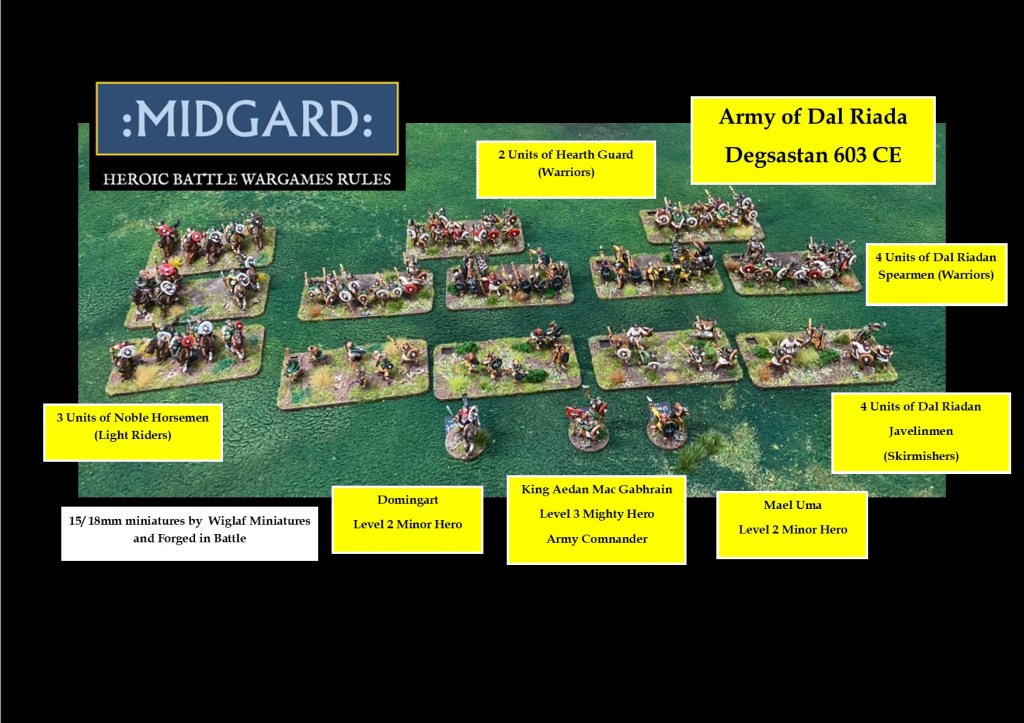 The two 15/18mm armies that we have used for our Degsastan 603 game are good examples of starter 300-point forces. All the units here are on 8 x 4 cm bases. Warrior units are approximately 10 miniatures to a base, Skirmishers 6 to a base and Horsemen (Light Riders) 5 to a base, which gives a total of around 100 minis for the Dal Riadan army and about 90 for the Northumbrians.