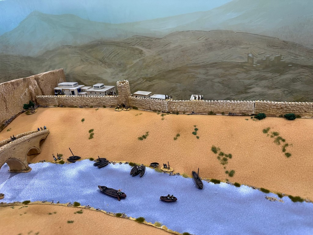 If I’d planned far enough ahead, I could have bought some boats, but as it was, I hand-carved them from scrap balsa wood with some details using Milliput and wire. They are relatively crude, but one of the joys of 6mm terrain is that you can get away with it.