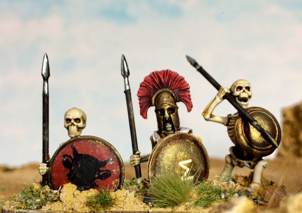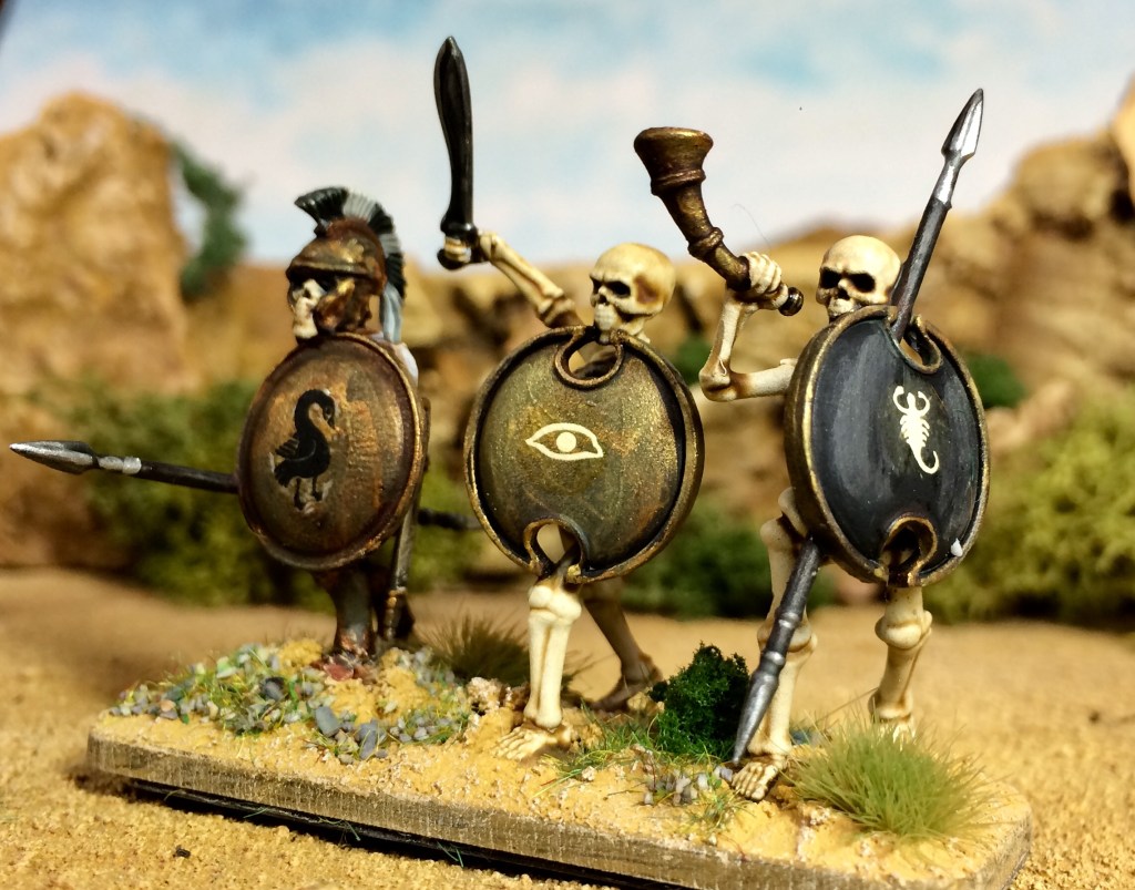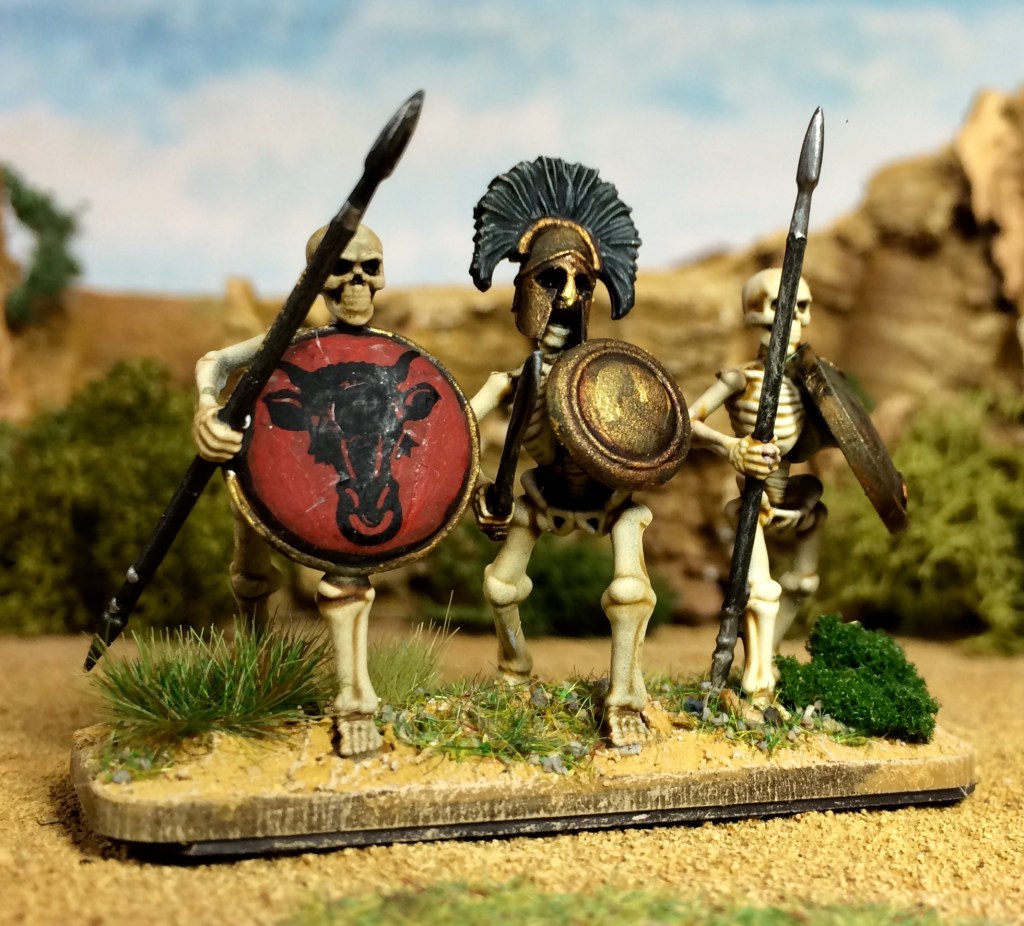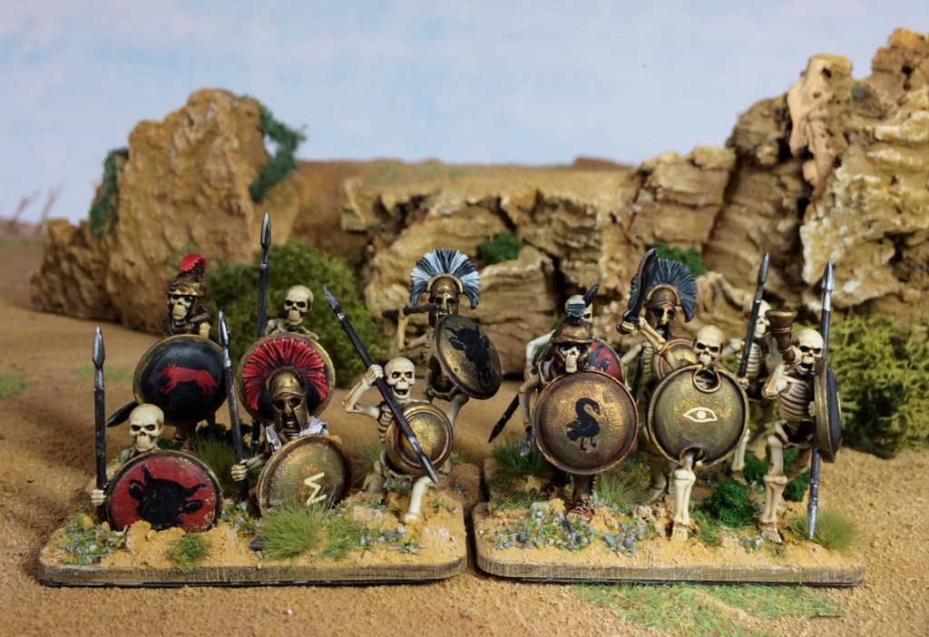 Left: skeleton warriors rising from the ground after Jason has sown the hydra’s teeth. Plastic 28mm miniatures from Wargames Atlantic https://wargamesatlantic.com/products/skeleton-infantry