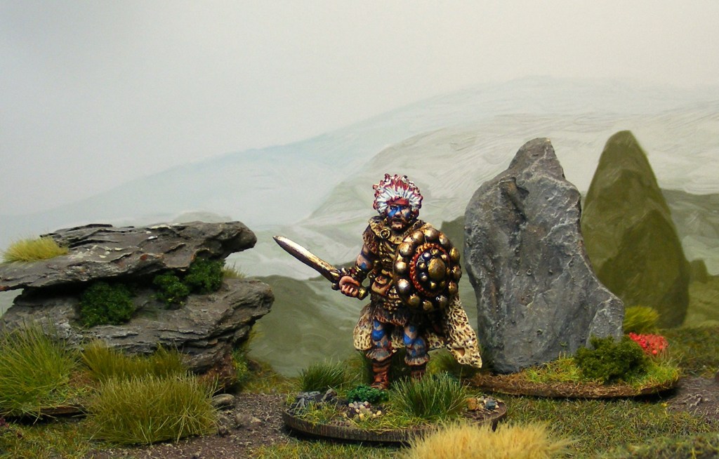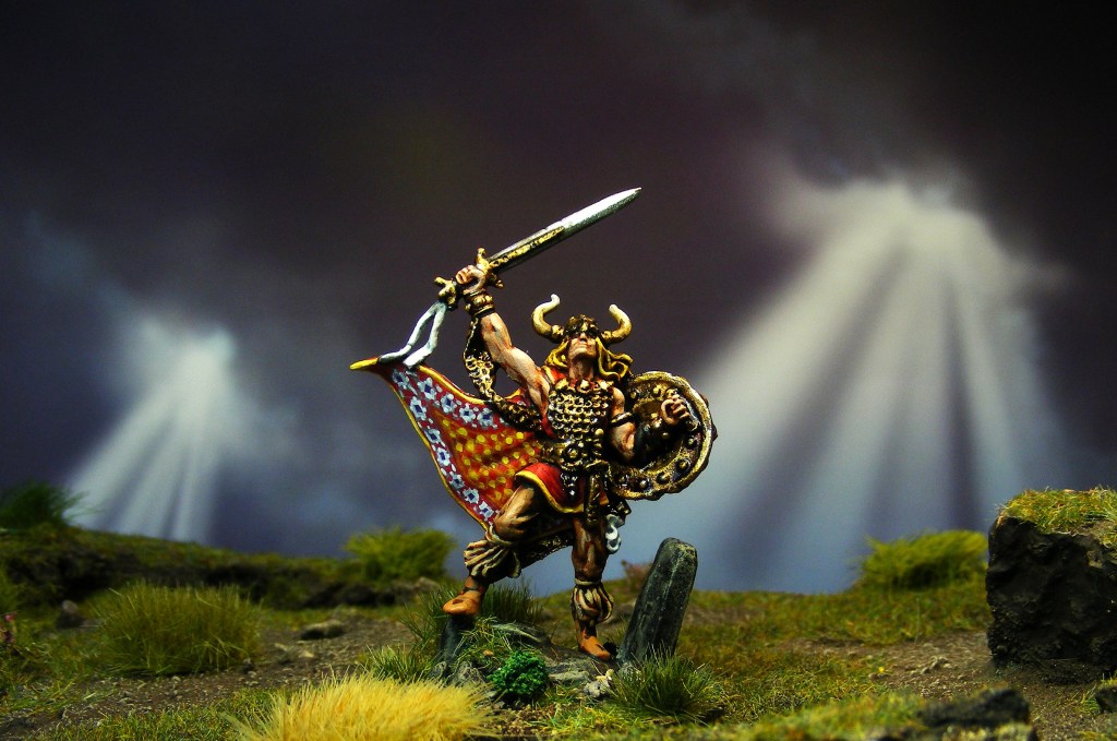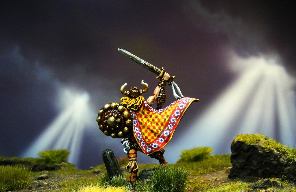 Next up is Lugh, the greatest warrior-craftsman of the Tuatha de Danaan. I’ll confess that I painted him up (a few years back) in a slightly different colour scheme to Jim’s original art, but I’m tempted to get another one to match his appearance in The Silver Arm.