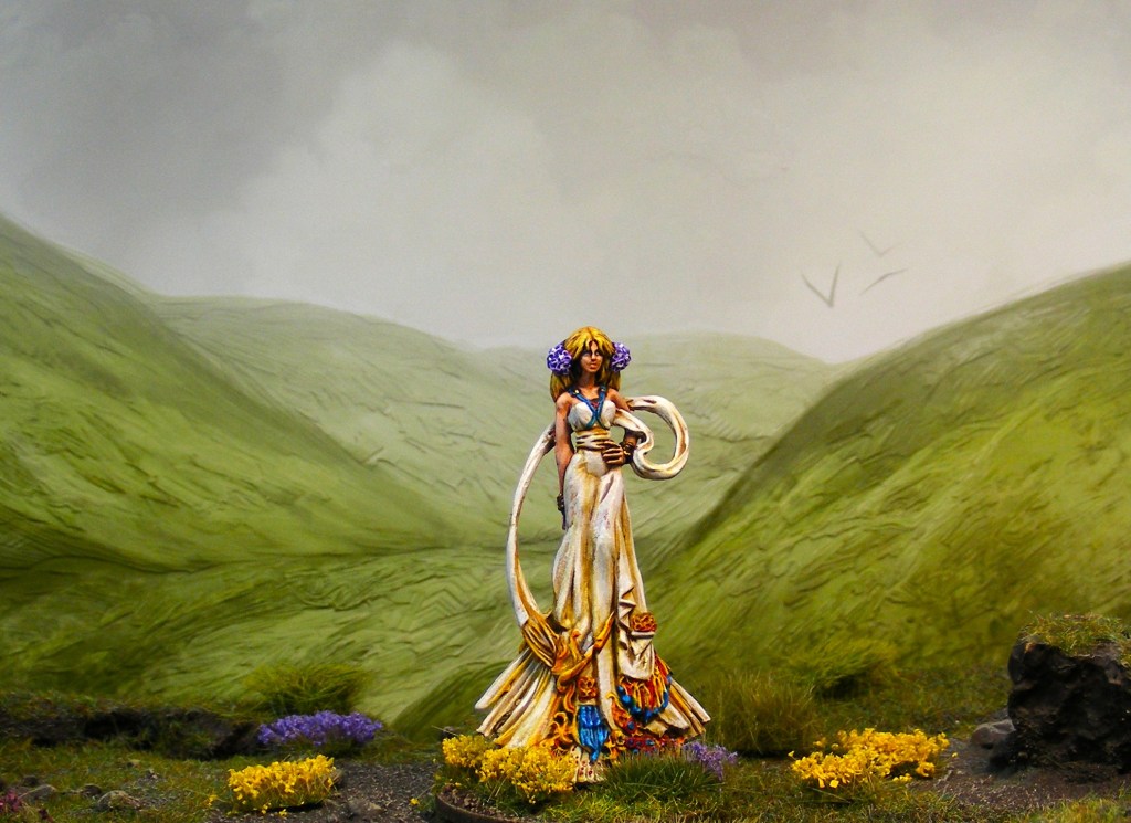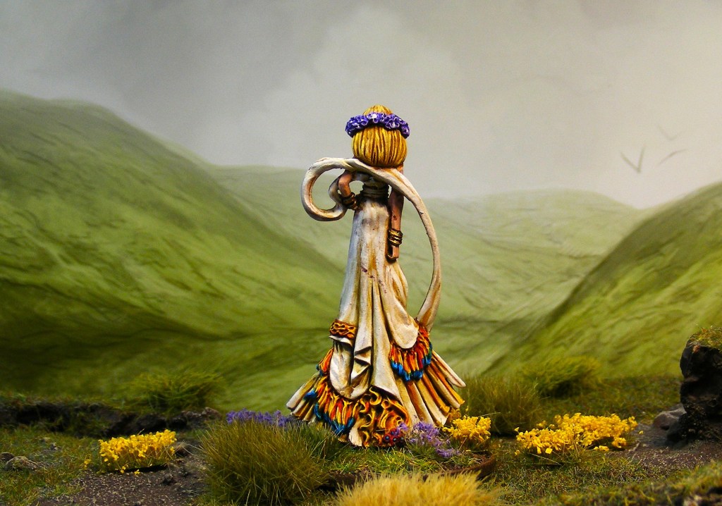 As well as these four characters from The Book of Conquests / The Silver Arm, I had a couple of others to work on. Erin, Goddess of Ireland was quite a challenge (in a different way to Nuada’s cloak), mostly involving picking out the various pieces of detail at the bottom of her dress. I decided to match the yellow and purple with complementary flowers using Gamers’ Grass tufts.