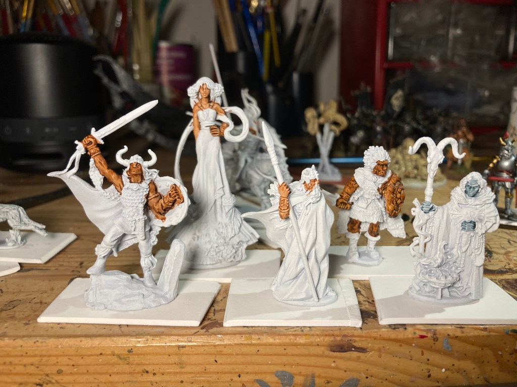 After a white undercoat, they had base layers of various GW Contrast Paints and acrylics (mostly Army Painter Fanatic) before I sat down with Jim’s art and painstaking tried to recreate some of the detail.