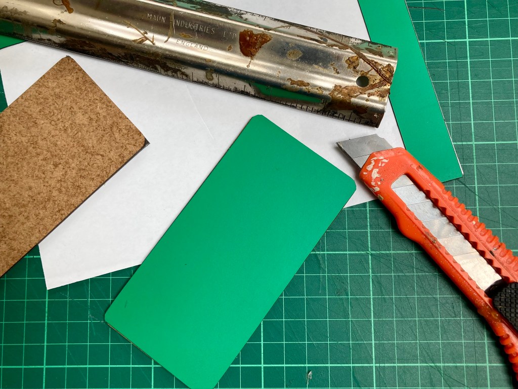 The unit base is faced with ferro steel for the top layer. While this shade of green isn’t very realistic, it doesn’t matter as it’s going to get a coat of paint in the next stage of the process. I simply cut it to size, stick it onto the MDF base and trim off the corners with a craft knife.