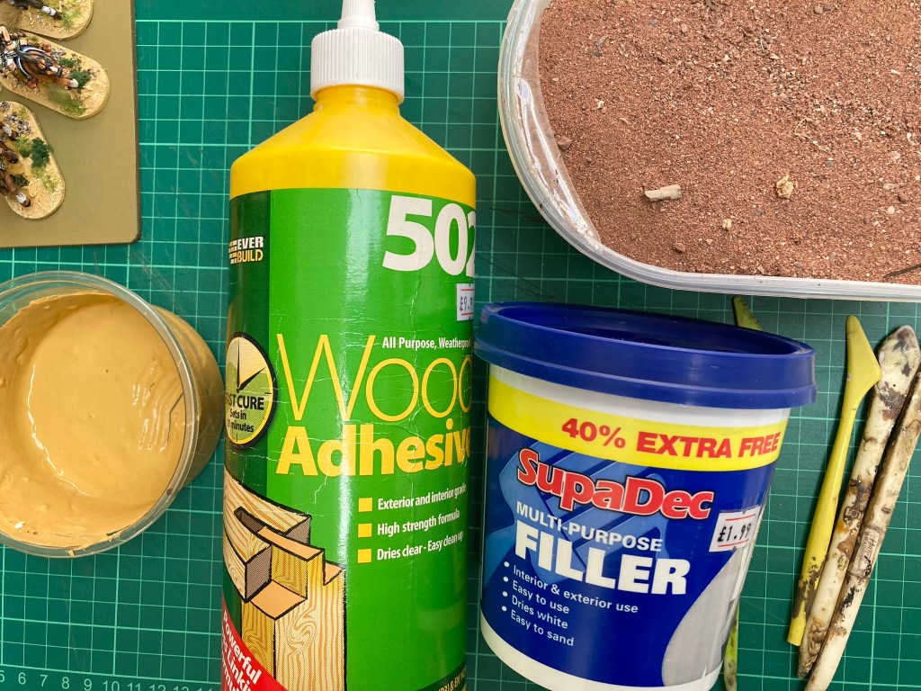 With the figures in position, it’s time to add some texture (note that this could all be done prior to spraying if you wished – it doesn’t matter). This is where I mix up some standard basing gunk using acrylic paint, filler and sand (also available as basing products from many manufacturers). This is applied around any large areas of base that I want to cover.