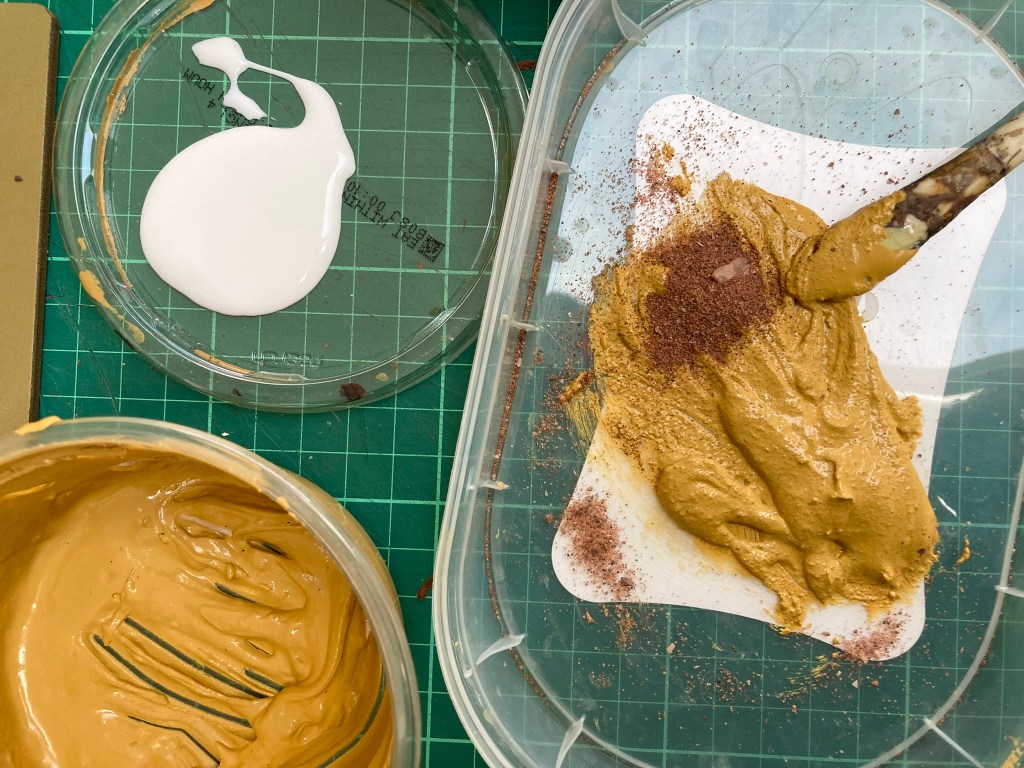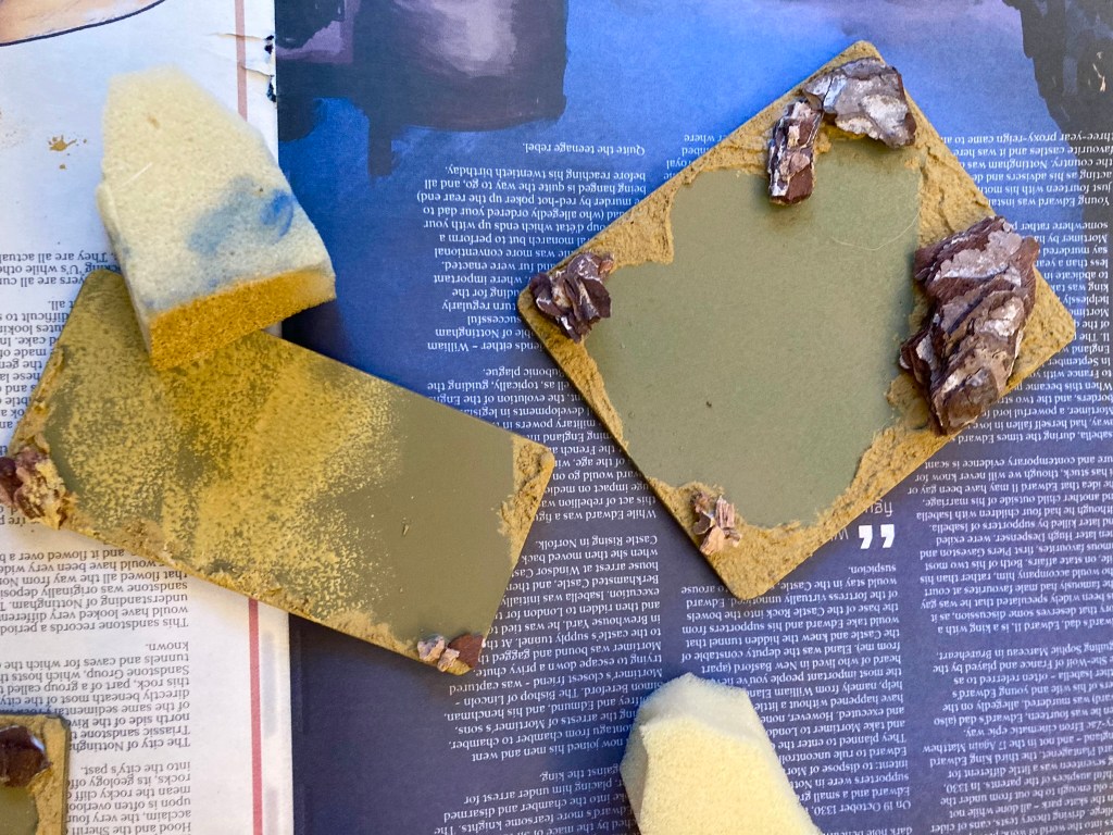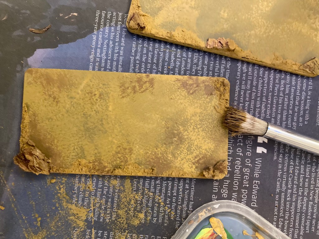 Here I am sponging the whole base with acrylic craft paint (same colours as seen above). The sponge gives a mottled look which is followed up by stippling patches of lighter and darker brown with a chunky brush. There’s no right or wrong way to do this – the only goal to get a nice-looking base.